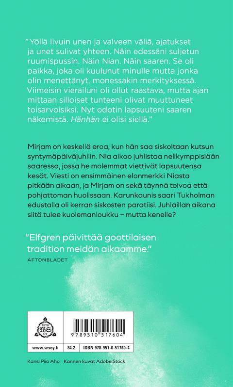 Myrsky raivosi ympärilläni, kun seisoin saaren korkeimmassa kohdassa. Takerruin puuhun, käsivarret kiertyivät rungon ympärille. Märkä kaarna painoi poskea. Käppyrämänty kalliolla, jolla olimme nuorena niin monta kertaa istuneet, Nia ja minä.