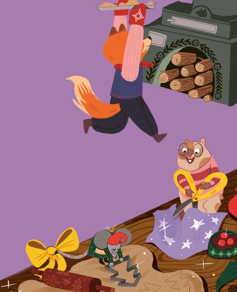 Kuun ja Isä-ketun kodissa alkoi kiireinen suhina, kahina ja rapina. Joka aamu, kun isä oli saanut päivän leivonnaiset valmistettua ja lähtenyt herkkuineen kohti joulukahvilaa, lapset valtasivat keittiön. Kuu ja Helmi leipoivat pellin toisensa perään pipareita, korppuja ja keksejä ja suunnittelivat, mitä kaikkea muuta kylän yhteisissä joulujuhlissa tarjottaisiin.