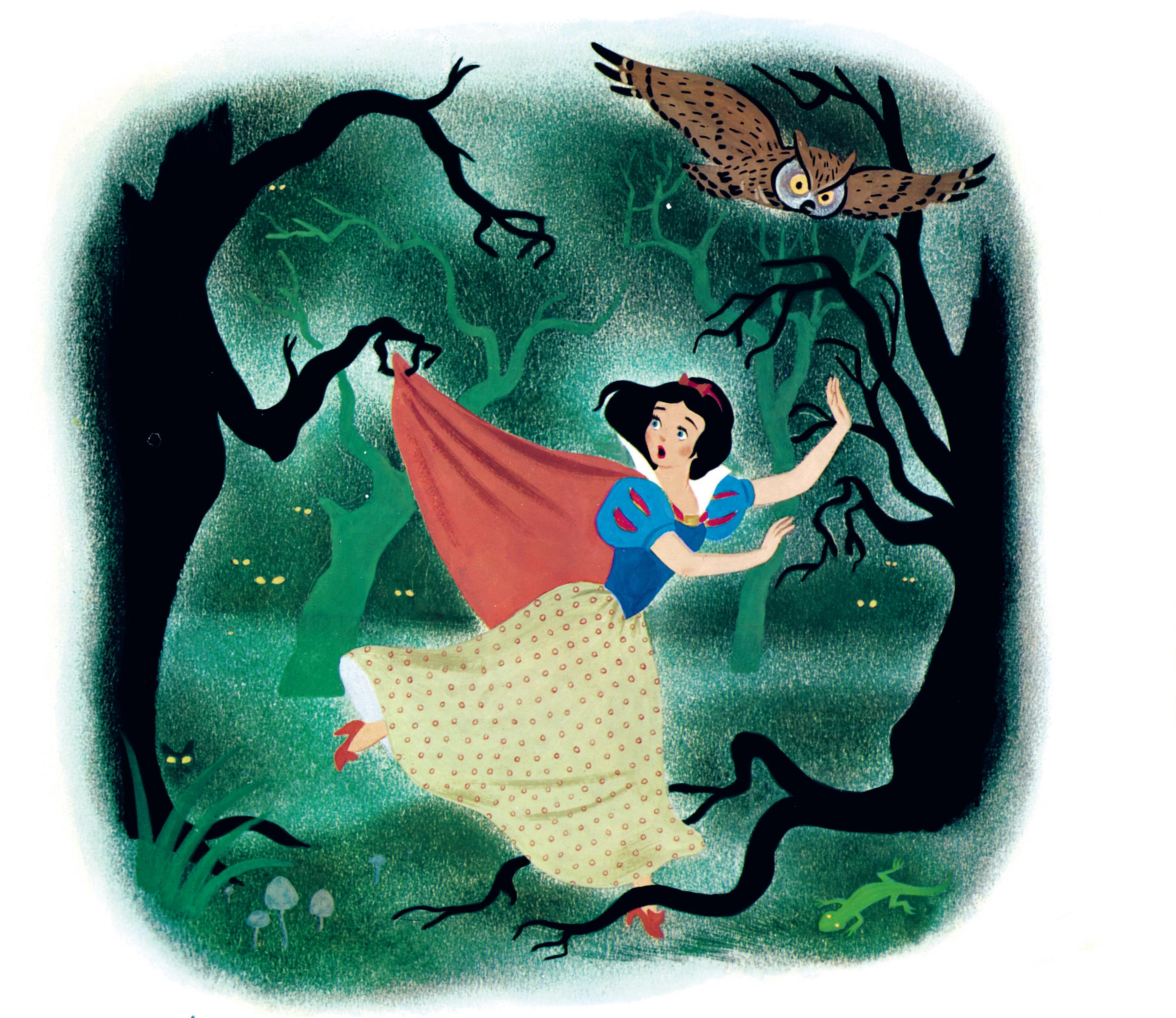 Yksin jäänyt Lumikki itki peloissaan. Hän pinkoi kyynelet