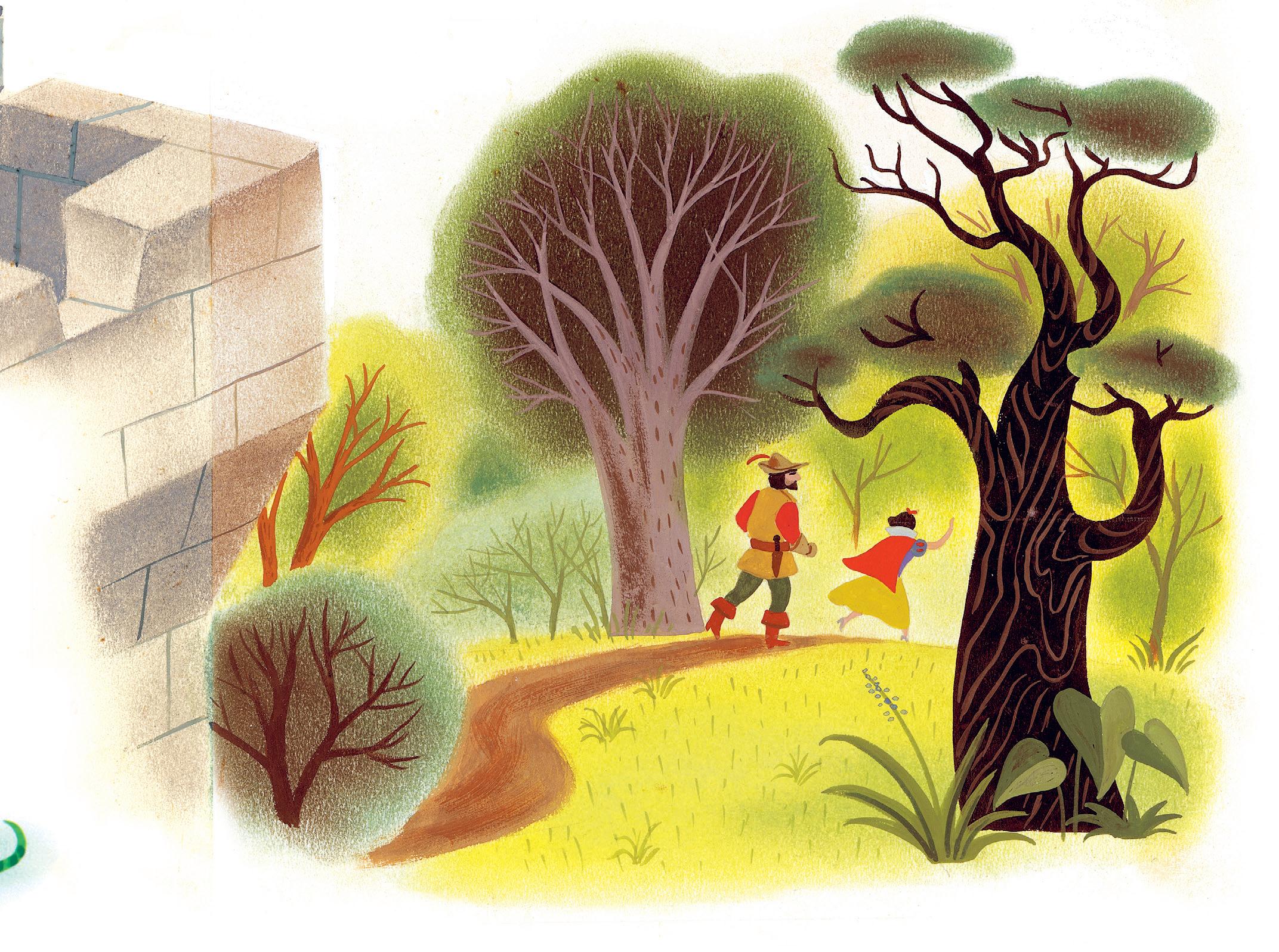 aavistamaton prinsessa hypähteli metsästäjän vierellä, pysähtyi aina välillä poimimaan kukkia ja lauleskeli iloisesti.