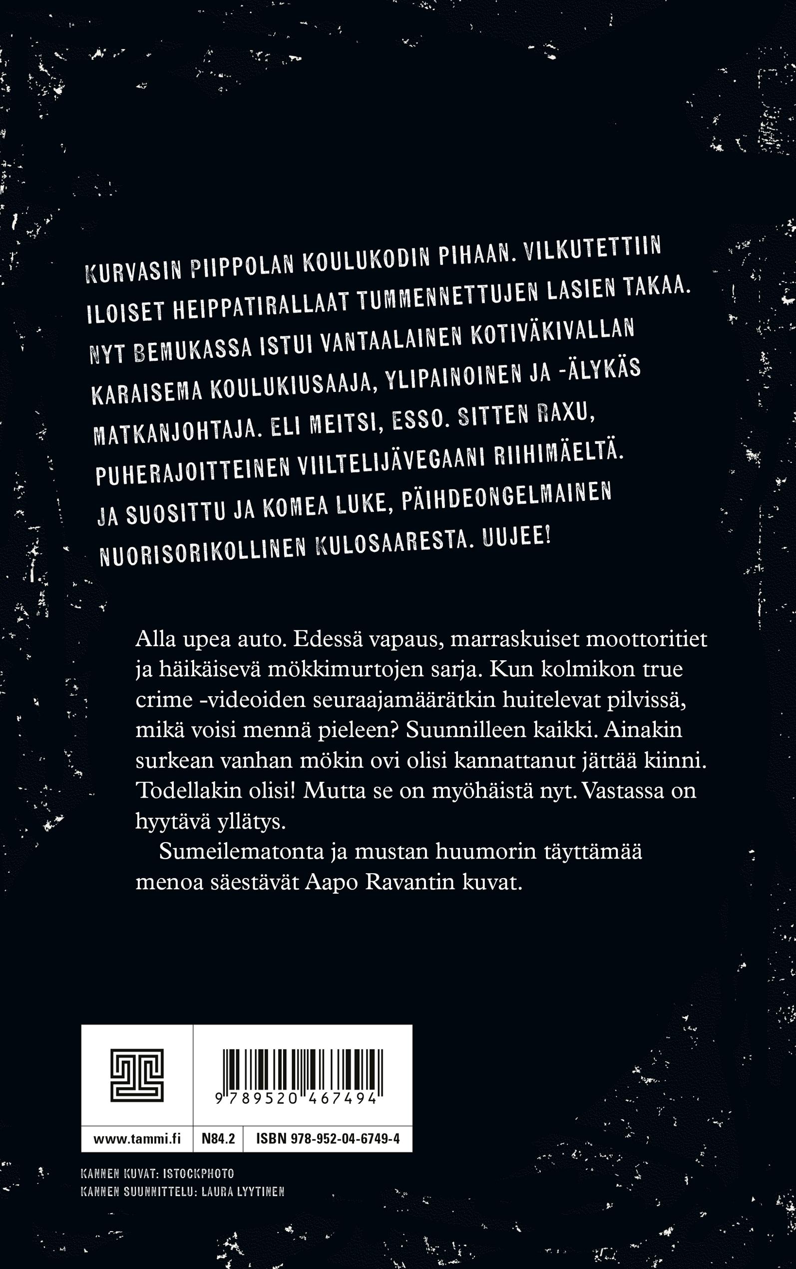 Otin autonavaimet, hymyilin valvontakameraan ja näytin peukkua. Kaapissa lojui myös Waltherpistooli. Heristin sormea kameralle, soo soo, ja työnsin aseen housujeni vyötärölle. Poimin talteen muhkean setelirullan, jossa oli noin kaks tonnia käteisenä. Faija oli aina varustautunut pahan päivän varalle. Se päivä oli tänään.