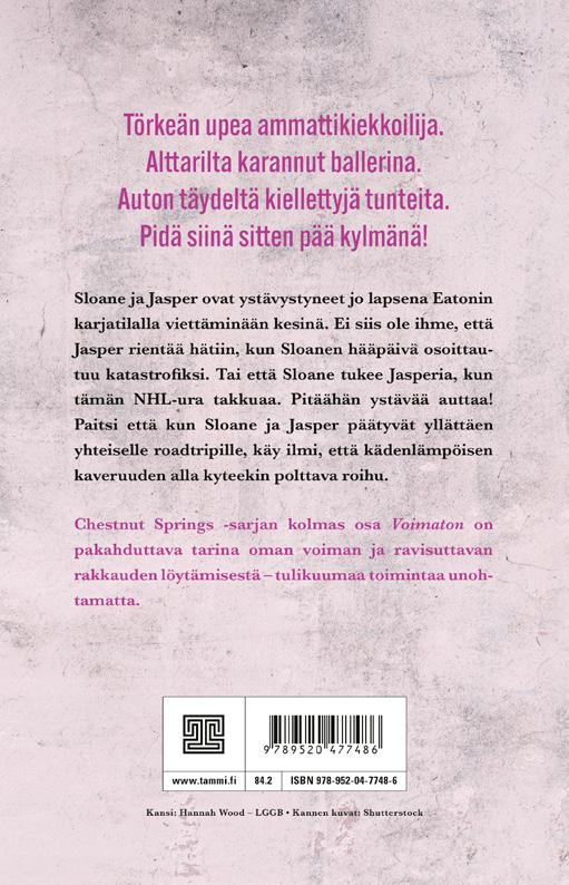 Nostan katseeni nopeasti takaisin hänen kasvoihinsa kuin olisin jäänyt kiinni jostakin. Kuin hän voisi jotenkin kuulla, mitä mielessäni liikkuu. Me molemmat kyllä tiedämme, etten saisi katsoa häntä sillä tavalla. Hän on käytännössä serkkuni, ja mikä pahinta, hän kuuluu virallisesti toiselle miehelle. Sterling huomaa katseemme ja kääntää taas huomionsa minuun. Se saa kylmät väreet kulkemaan selkäpiitäni pitkin. ”Sloane on kertonut, että olette olleet ystäviä jo kauan. Suo anteeksi hämmennykseni, mutta hiomaton jääkiekkoilija ei tunnu olevan tyypillinen primaballerinan ystävä. En sitä paitsi ole nähnyt sinua kovin usein sen jälkeen, kun Sloane ja minä aloimme seurustella. Onko siihen jokin syy?” Sterling kietoo kätensä omistavasti Sloanen hartioille ja minä yritän olla kiinnittämättä siihen huomiota.