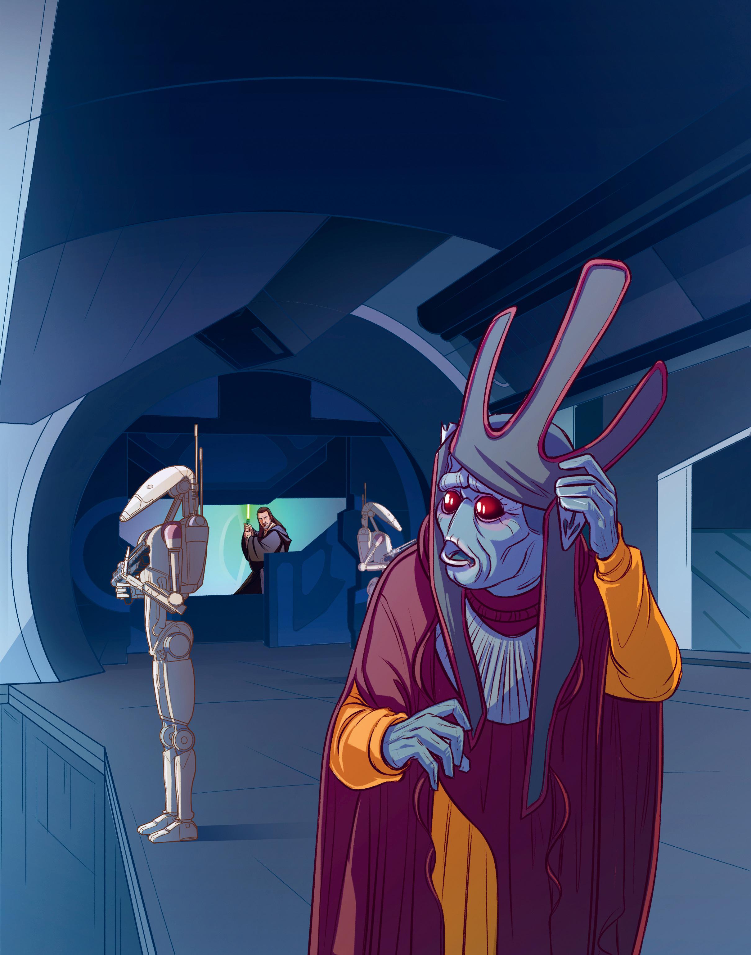 Varakuningas lähetti ryhmän taisteludroideja hoitelemaan jedit, mutta kun hytin ovi avattiin, Qui-Gon ja Obi-Wan loikkasivat ulos valmiina taisteluun. He olivat pidättäneet hengitystään, eikä kaasu ollut tainnuttanut heitä.