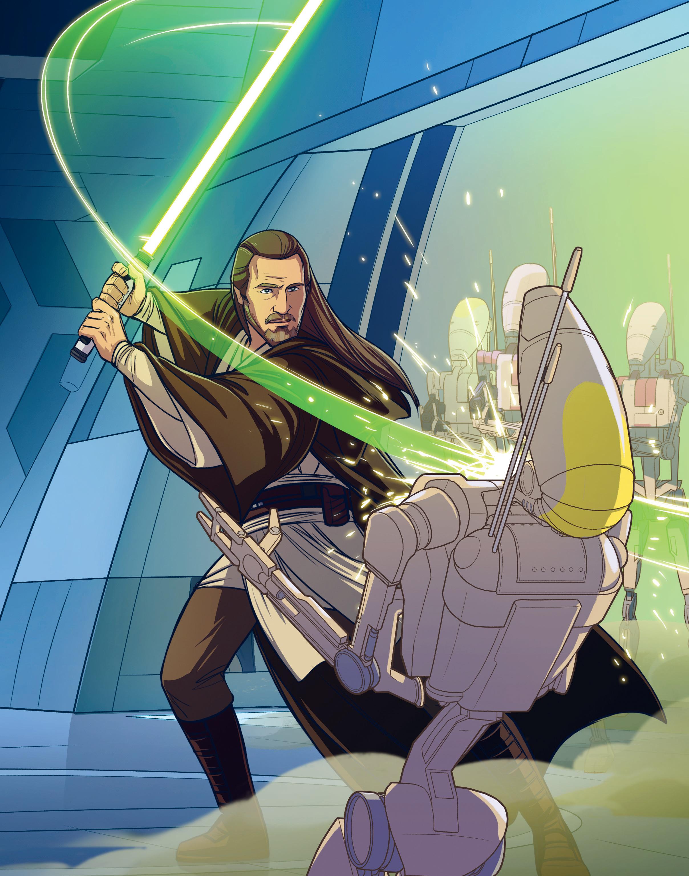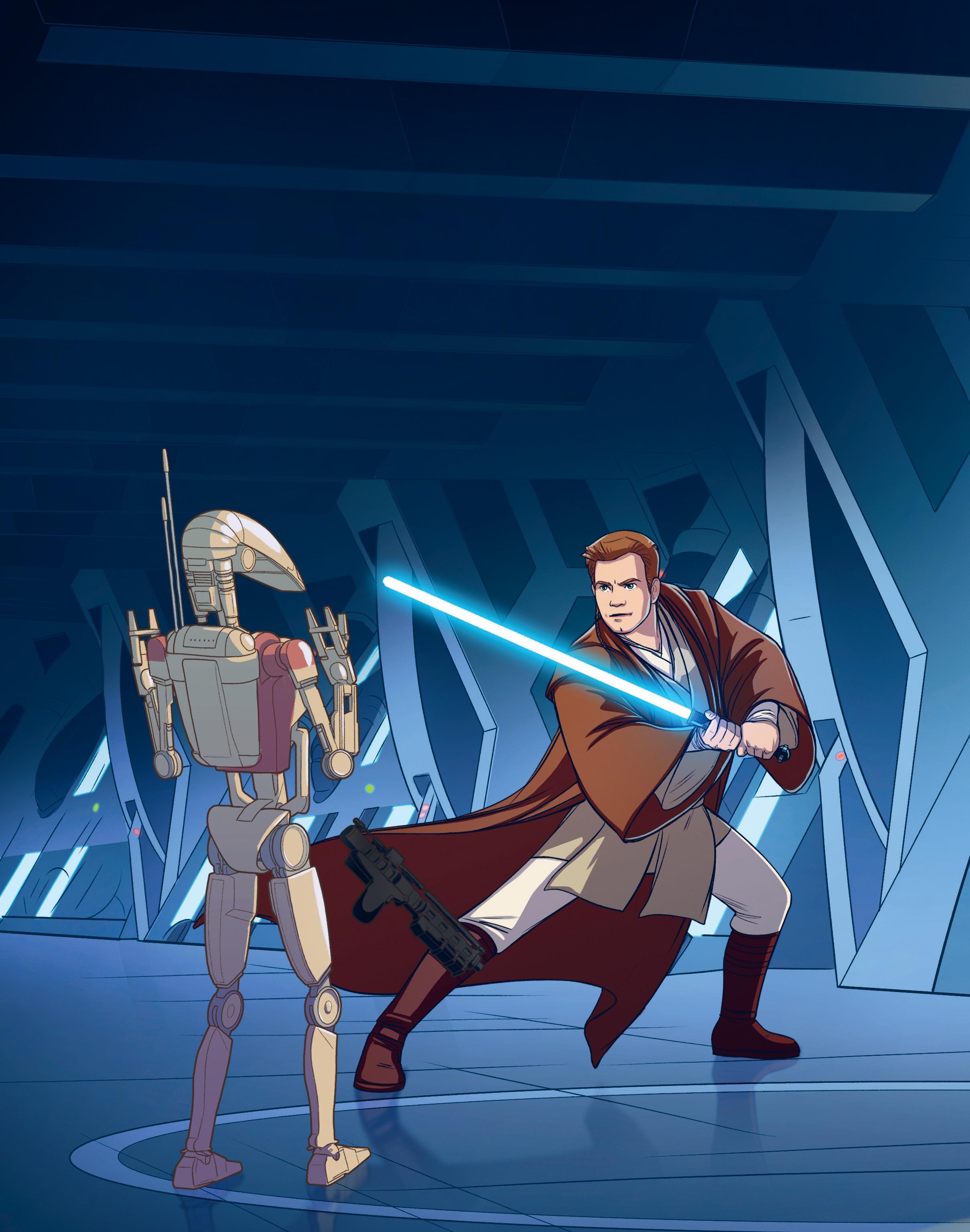 Taisteludroidit tulittivat hurjasti sädekivääreillään, mutta jedien valomiekat torjuivat jokaisen laukauksen. Miekkojen hehkuvat terät leiskuivat ja kipinöivät, ja droidipartio oli hetkessä lyöty maahan.