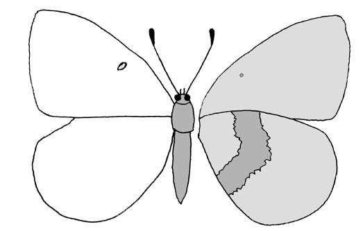 Sinappiperhosen vasemman etusiiven tyvellä on jälki linnun nokasta.
