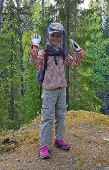 Meidän perheessä emme käytä hyttysmyrkkyjä vaan suojaudumme vaatetuksella. Kesäkuisella retkellä oli runsaasti verenimijöitä, mutta tällä varustuksella niillä ei ollut pääsyä iholle.