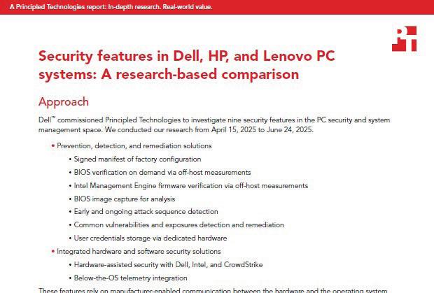 1 Based on Dell internal analysis, October 2024 Applicable to PCs on Intel processors Not all features available with all PCs Additional purchase required for some features Validated by Principled Technologies A comparison of security features
