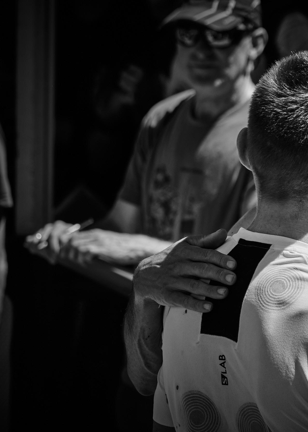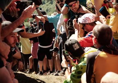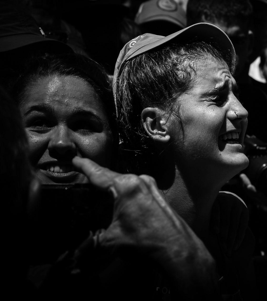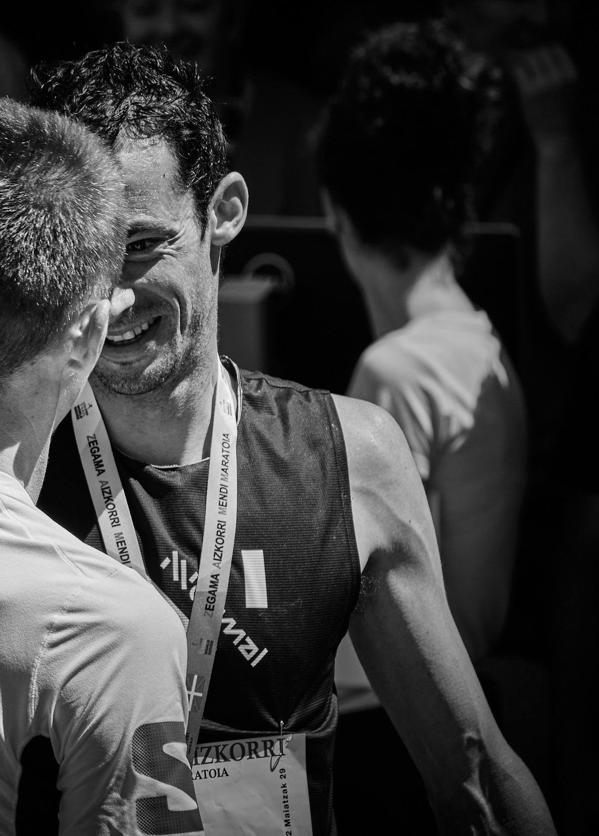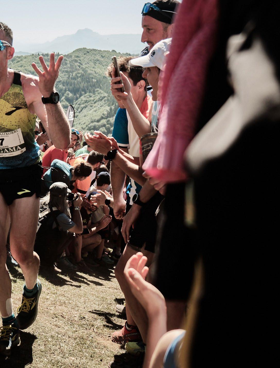 Decimos “simultáneamente” cuando podríamos haber elegido “en doble dirección”. Y es que precisamente esa euforia es así como se manifiesta en la que es la subida más icónica del trail running mundial. Por un lado, los espectadores, miles de ellos, muestran una euforia en forma de alegría nada contenida cuando ven pasar a aquellos que más admiran. Lo que allí viven es algo excepcional, brutal, tremendo. Se agotan los calificativos. Pero, además, o precisamente por esta circunstancia, los corredores entran en un estado de euforia que hace más referencia a la primera de las acepciones de este término: capacidad de resistir el sufrimiento y la adversidad para continuar hacia arriba. Es difícil encontrar a alguno de ellos que muestre en su rostro el cansancio de los aproximadamente 21 kilómetros que llevan en las piernas. Suben en una especie de catarsis. Lo hacen sintiéndose en comunión con los que los jalean y animan en una lucha que por unos dos kilómetros deja de ser tal para convertirse en una fiesta. Reciben fuerza para continuar. Esto, entre otras cosas, es Zegama. Precisamente, sobre el inicio de esta subida, concretamente de los 34 minutos que van desde las 10:42 AM hasta las 11:15 AM del pasado día 29 de mayo, hemos preparado un artículo con fotografías de Black Coffee Studio que pretende ser una película de lo que allí ocurrió.