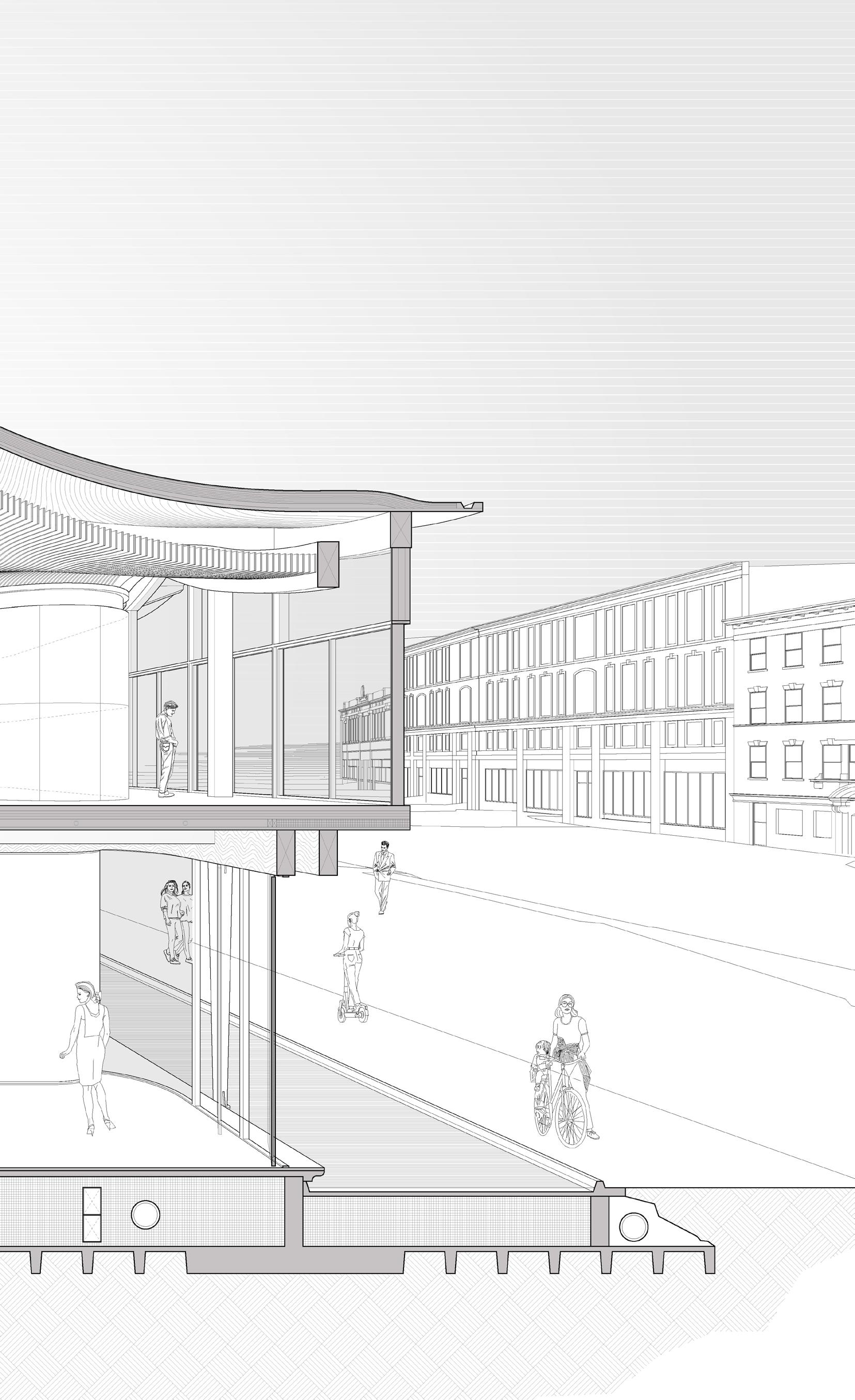 Bridging the phantom of tail lights flashing by and the empty tequila bottles left behind, a library stands as a terminal that facilitates two systems of movements – bringing visitors from two worlds that hardly meet while sanctuarizing the moments of encounter among this post-pandemic society.
