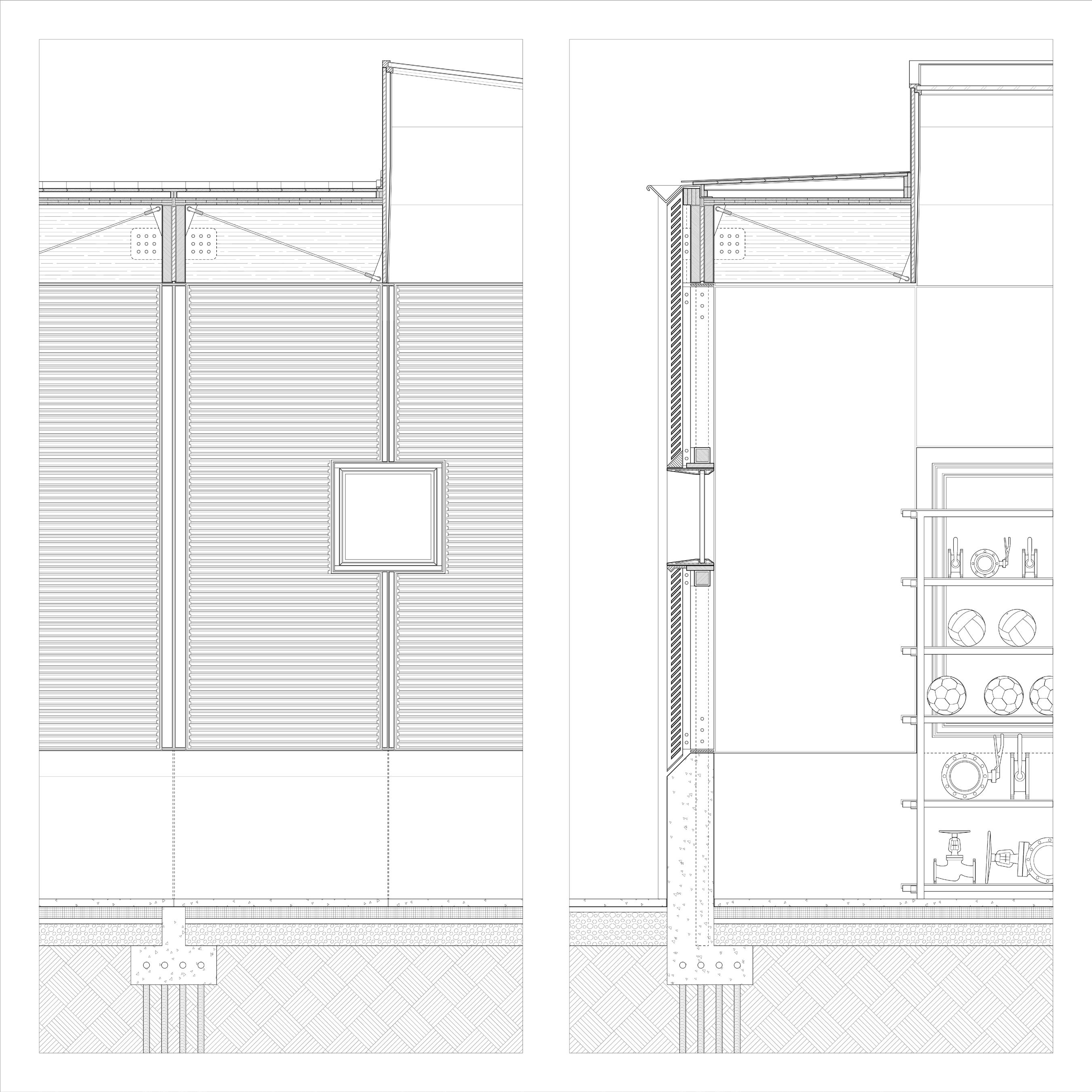 THE FACADE is lined with Polycarbonate Louvers, which brings in diffused daylight while allowing for natural ventilation across the storage space. The facade that faces the street is to have an array of view ports, which is operable based on the weather condition while affording the passerby a peak into the sailing school. The Southern Facade, however, is punctured with large openings -both enclosed and fully open -- that bring the ocean view into the warehouse.