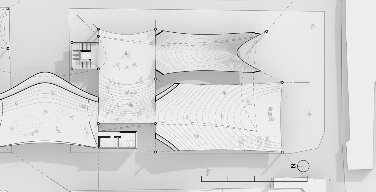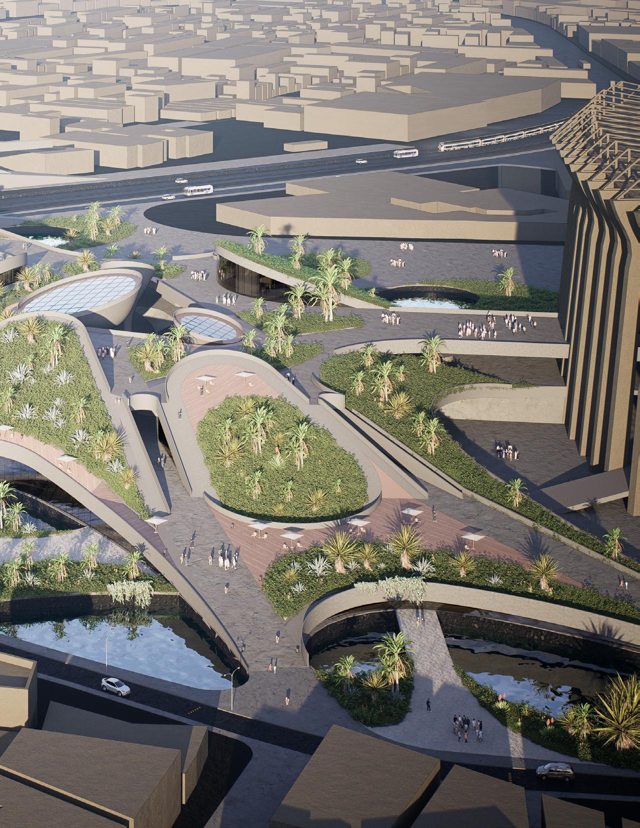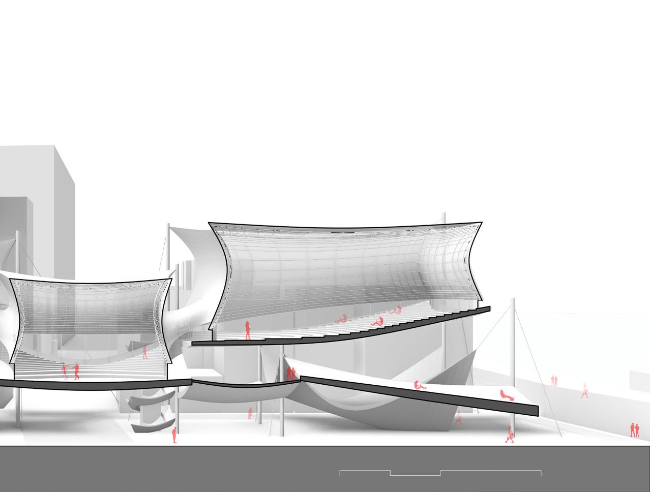 The design begins by identifying and connecting multiple potential spots around the site. Public programs, positioned alongside an activated pedestrian network, transform these points into key urban nodes. At the same time, rainwater collected from the building’s surfaces and a flood-responsive plaza serve as passive strategies to address both water scarcity and flooding.