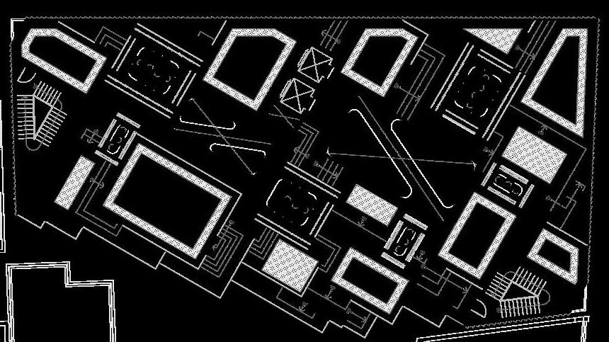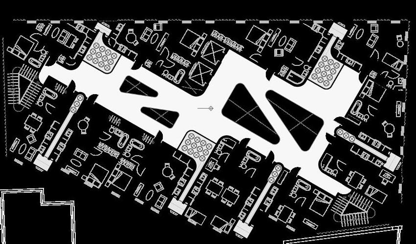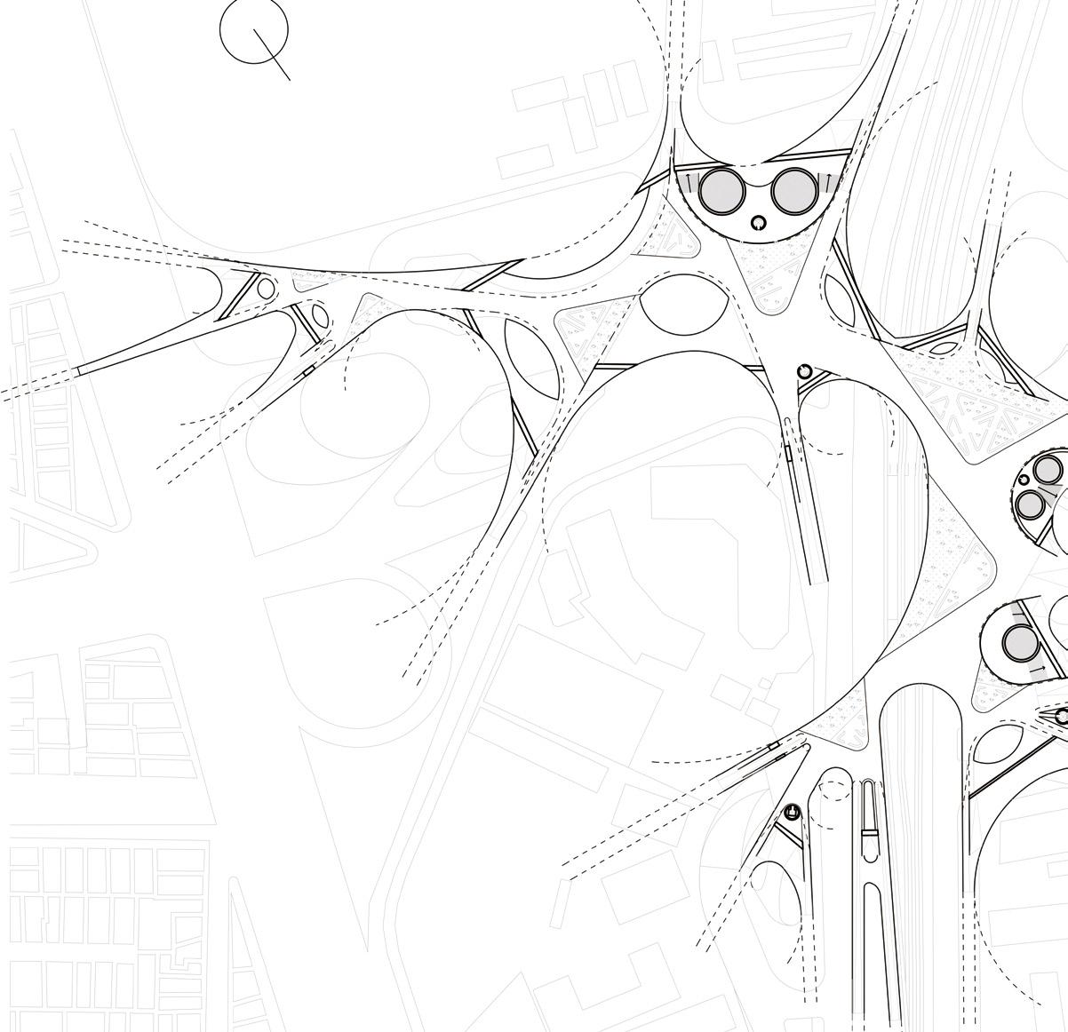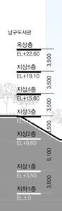 The ground space condition diagram illustrates a porous form carved by human movement, revealing unique spatial qualities shaped through circulation. Unlike the uncomfortable underpasses of conventional footbridges, this serves as a strong example of how pedestrian infrastructure can be integrated with architecture to function more effectively.