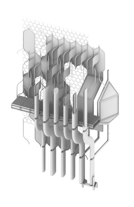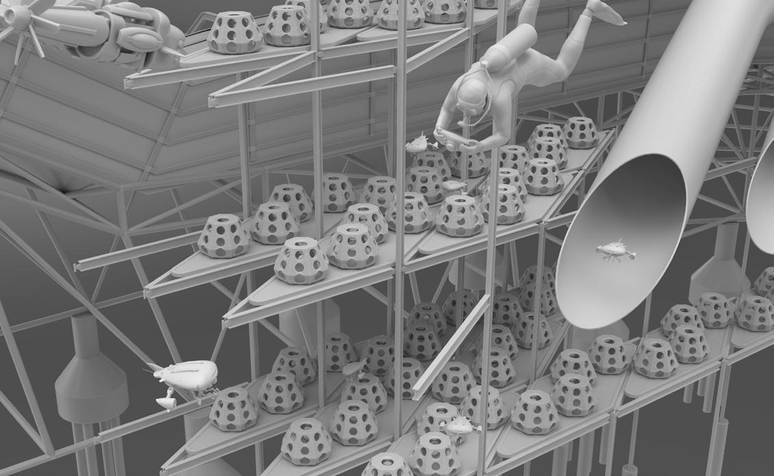 This project encompasses infrastructure for automated oyster farming, reef production and maintenance, as well as public programs for education. Based on biological metaphors, we approached the design with a systems-thinking mindset rooted in scalable and selfsustaining biological processes.