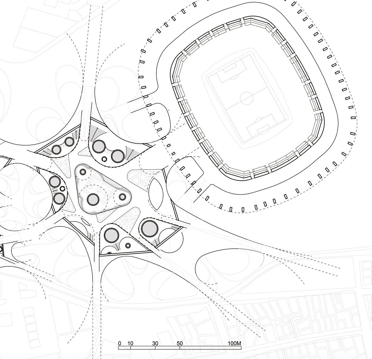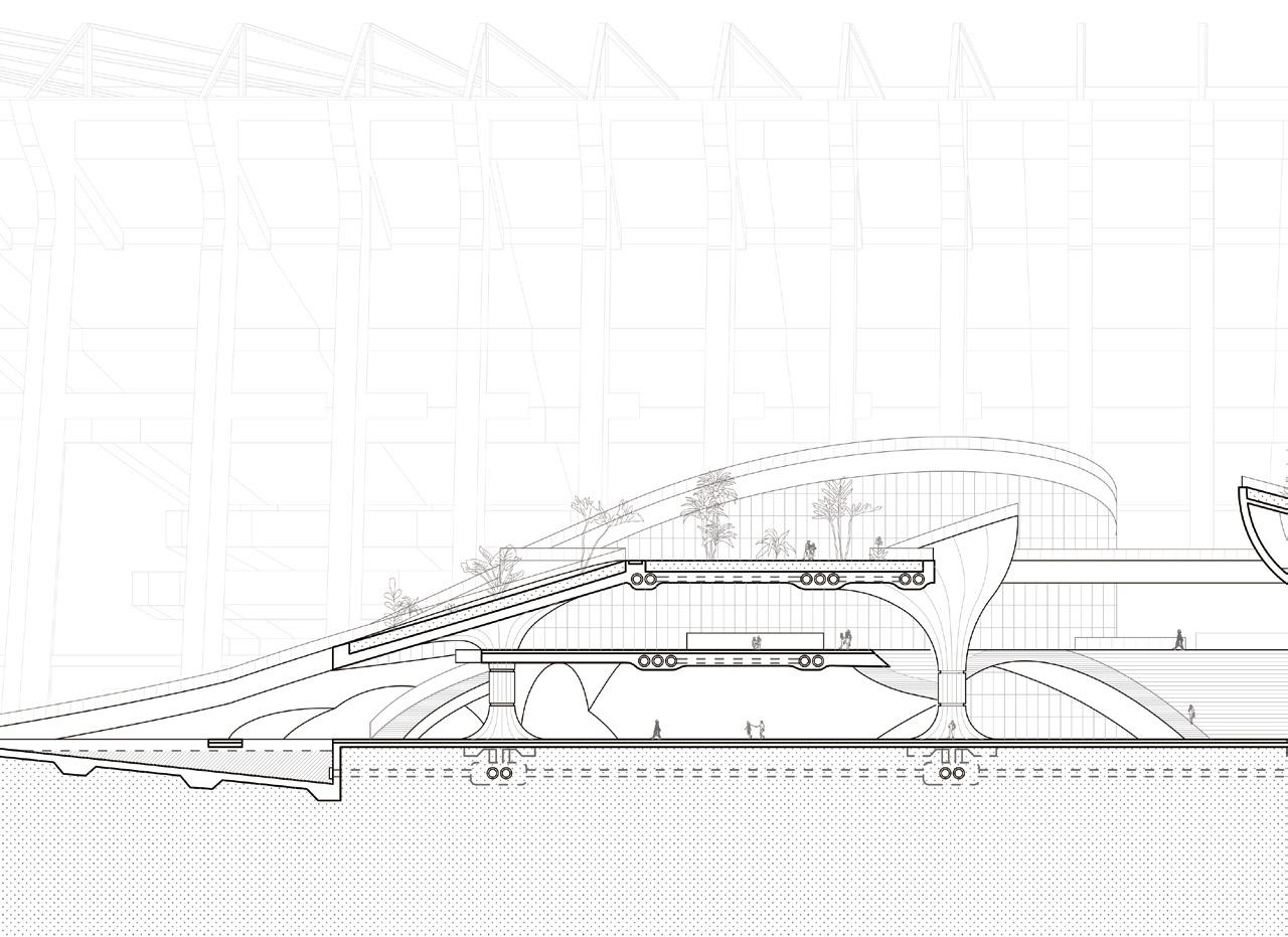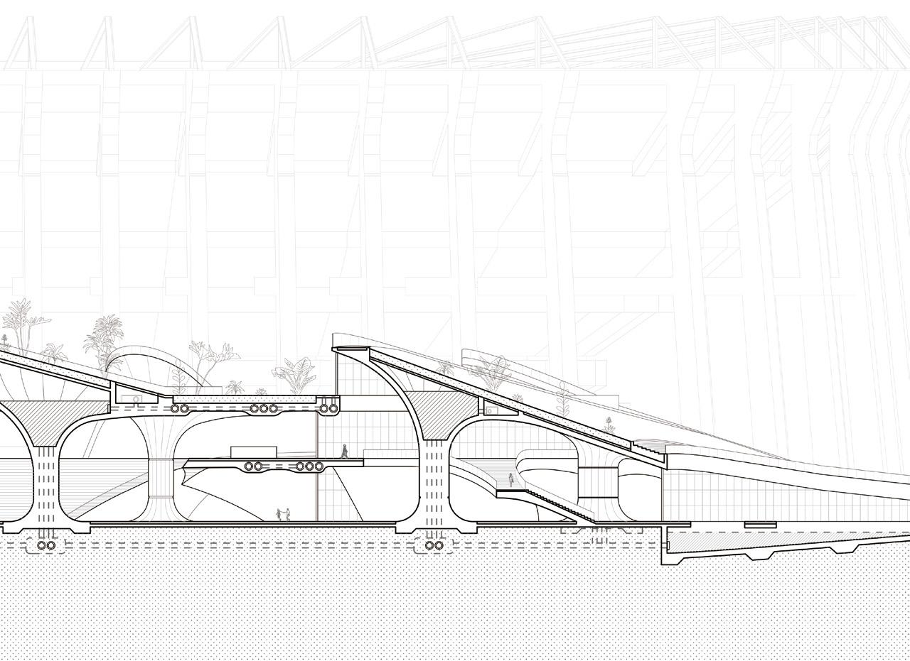 The floor plan not only performs the system of water collection, filtration, storage, and distribution but is also designed to adapt to both everyday conditions and large-scale events such as the World Cup, where massive crowds gather and disperse. The second floor primarily functions as a circulation level; on ordinary days, it accommodates a vendor market and provides space for the local community to stroll and gather. During events, however, all spaces can be cleared to accommodate large flows of people.