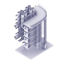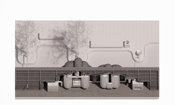 Among the various hybrid models, objects suitable for residential and public programs were selected. The multi-family housing is composed as if made of modular units, resonating with the logic of windfall. Meanwhile, the park is envisioned not as a standardized or efficiency-driven space, but as a place where people can linger and relax—integrated with CO₂ processing casings. These hybrids embody both functional and sculptural qualities, visualizing how CO₂-capturing technology can naturally permeate the urban context. Renderings of the selected hybrids present concrete spatial images, revealing a new hybrid atmosphere within familiar cityscapes.