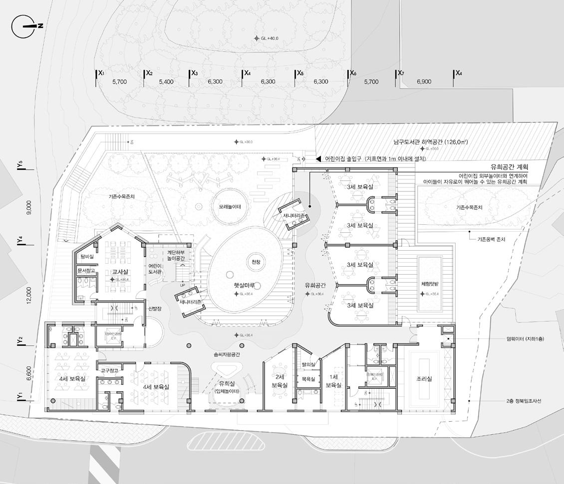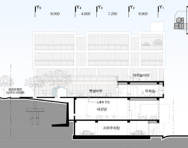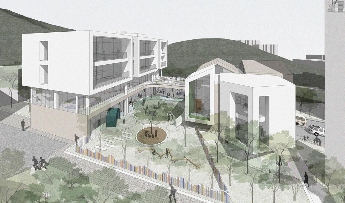 This project aims to achieve both public accessibility and security by leveraging the unique characteristics of the site. The site is located on a steep slope, with a small forest at the rear and a main pedestrian road at the front. Taking advantage of this terrain, the outdoor play area is placed on the upper level, enclosed by the building and the forest to ensure a safe environment for children. Meanwhile, the multipurpose auditorium is positioned on the lower level, enhancing accessibility not only for the children at the daycare but also for local residents. Through this design, the facility goes beyond its childcare function to serve as a communal space for the neighborhood.