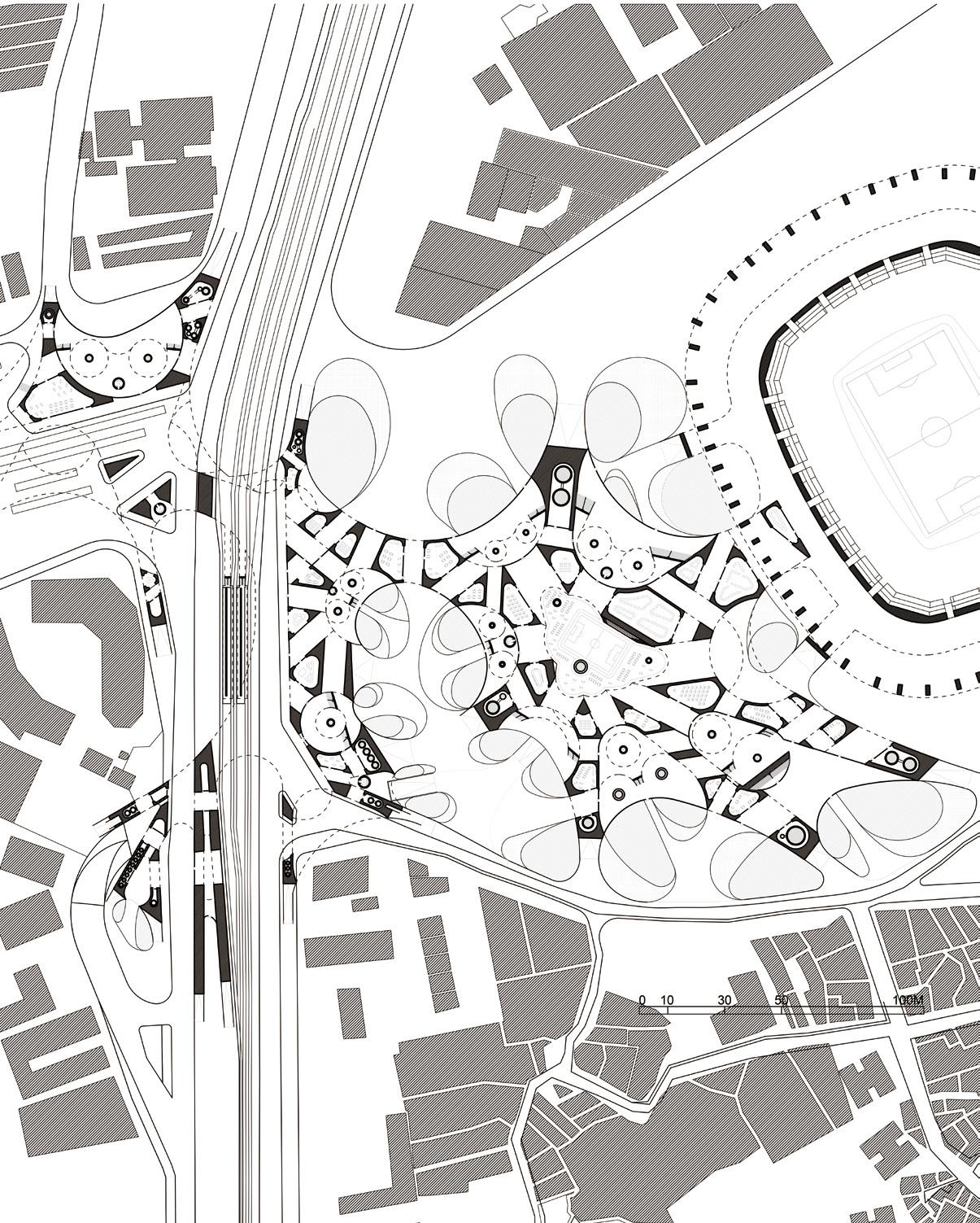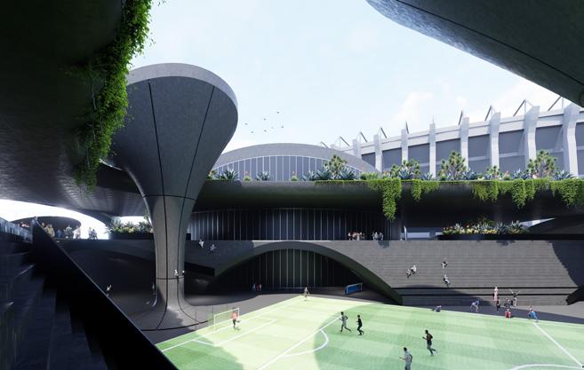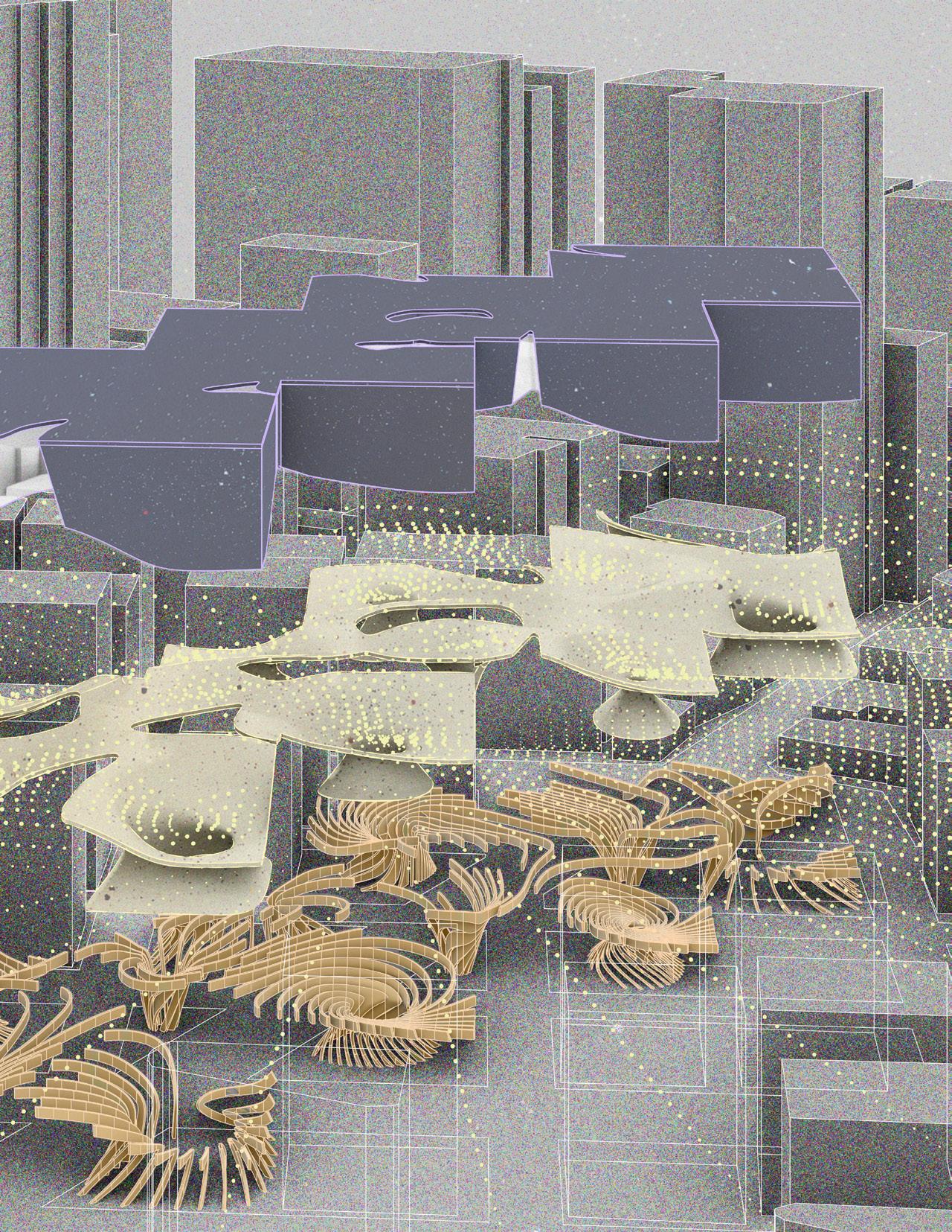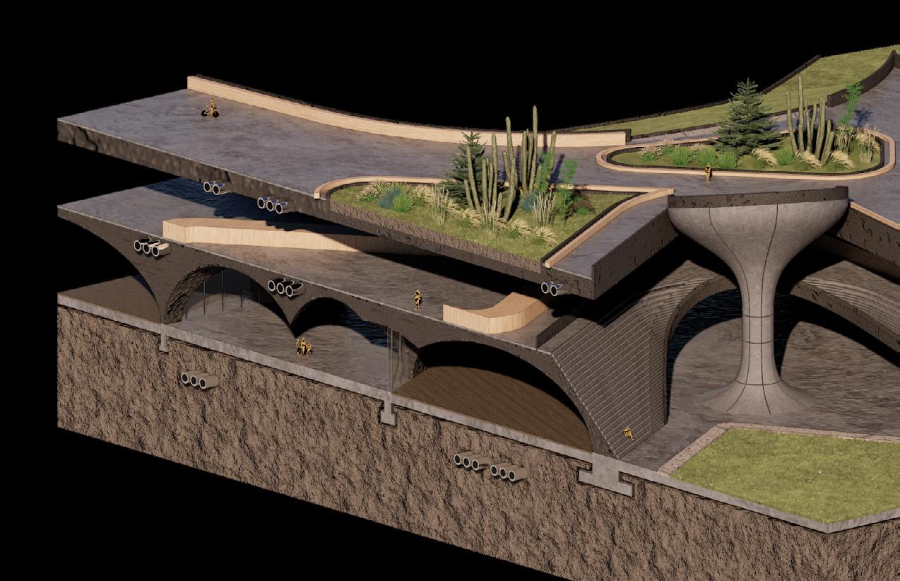 This project is located near the Norte Stadium in Mexico City and speculates on the city’s future conditions before and after large-scale events such as the upcoming World Cup. It addresses the paradoxical challenges of water scarcity and flooding that affect the city, reconnects pedestrian networks fragmented by road infrastructure, and provides new public space. More importantly, through a speculative lens, the project extends beyond problem-solving to propose an experimental framework that reimagines how infrastructure and urban life can generate new possibilities for community activation and resilience.