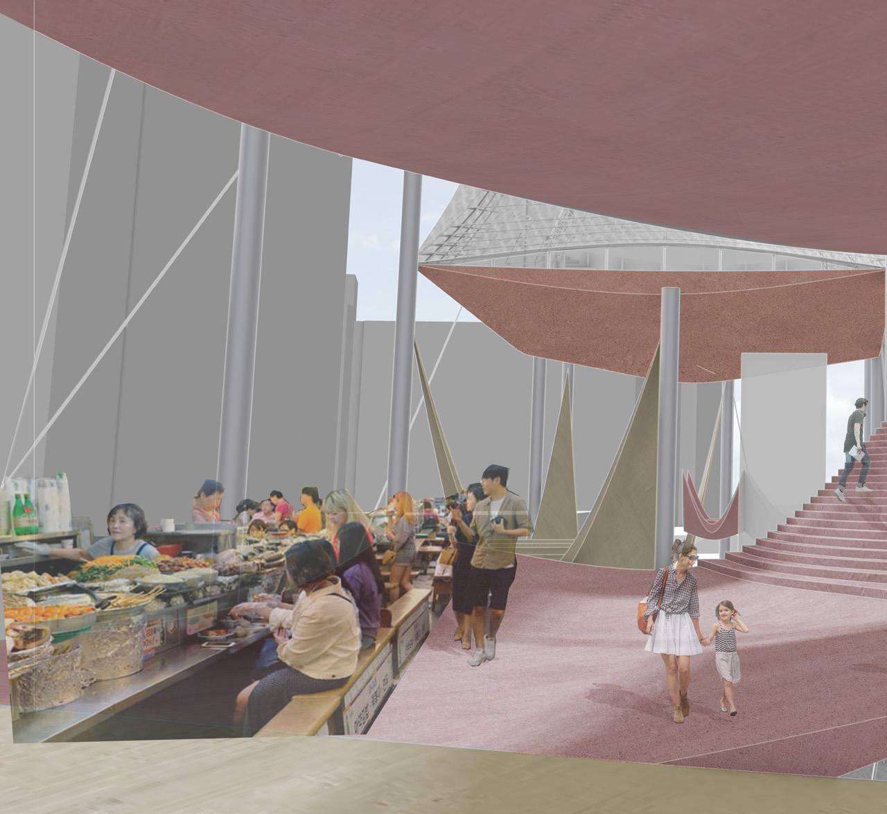 The suspended, overlapping canopies serve as the building’s surface, symbolizing the market’s disorderly yet harmonious character. Through gaps between them, fragmented scenes of the market emerge, immersing visitors in its atmosphere. Together with the market’s historical value, this complementary architecture enriches the community and elevates the market as both a daily hub and a tourism asset.