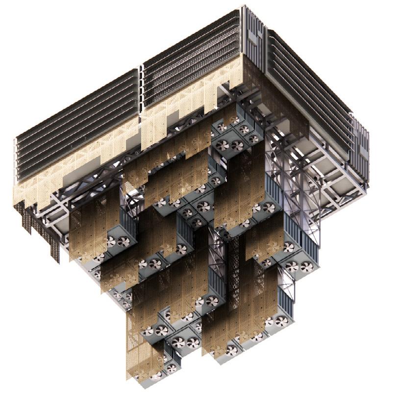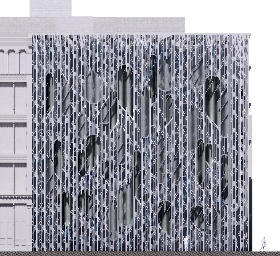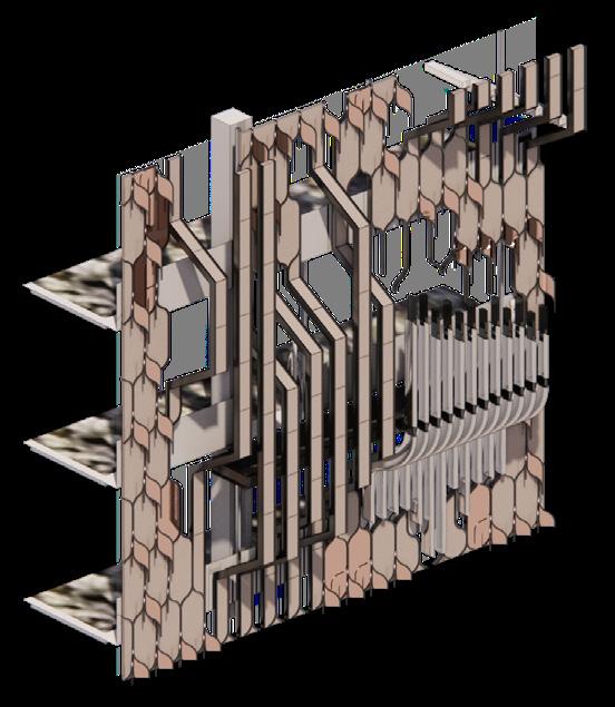 The final façade, shaped through layering and density testing, metaphorically resembles a waterfall. It introduces a pocketpark quality into the city’s vertical monotony, with each layer abstracting elements of flowing water—streams, stones, and mist—turning the skin into both structure and poetic image.