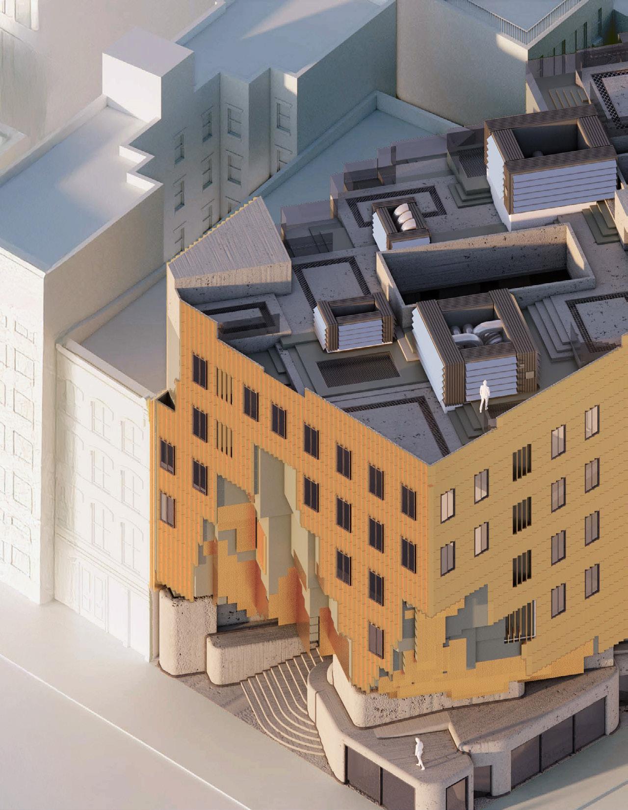 In the final stage, the project is articulated as a single building operating in dialogue with its context. At the rear of the site, where the balconies of adjacent buildings face inward, the CO₂ Free Park is strategically placed in respect to this condition. The surrounding buildings emphasize a repetitive verticality, which the design both acknowledges and reinterprets. This results in a gradually recessed, cave-like entrance at the front, contrasted by a vastly open public park at the rear. The strong juxtaposition of these elements produces a spatial drama, allowing the building to operate as an architectural form that resonates with its context while offering a new type of public space.