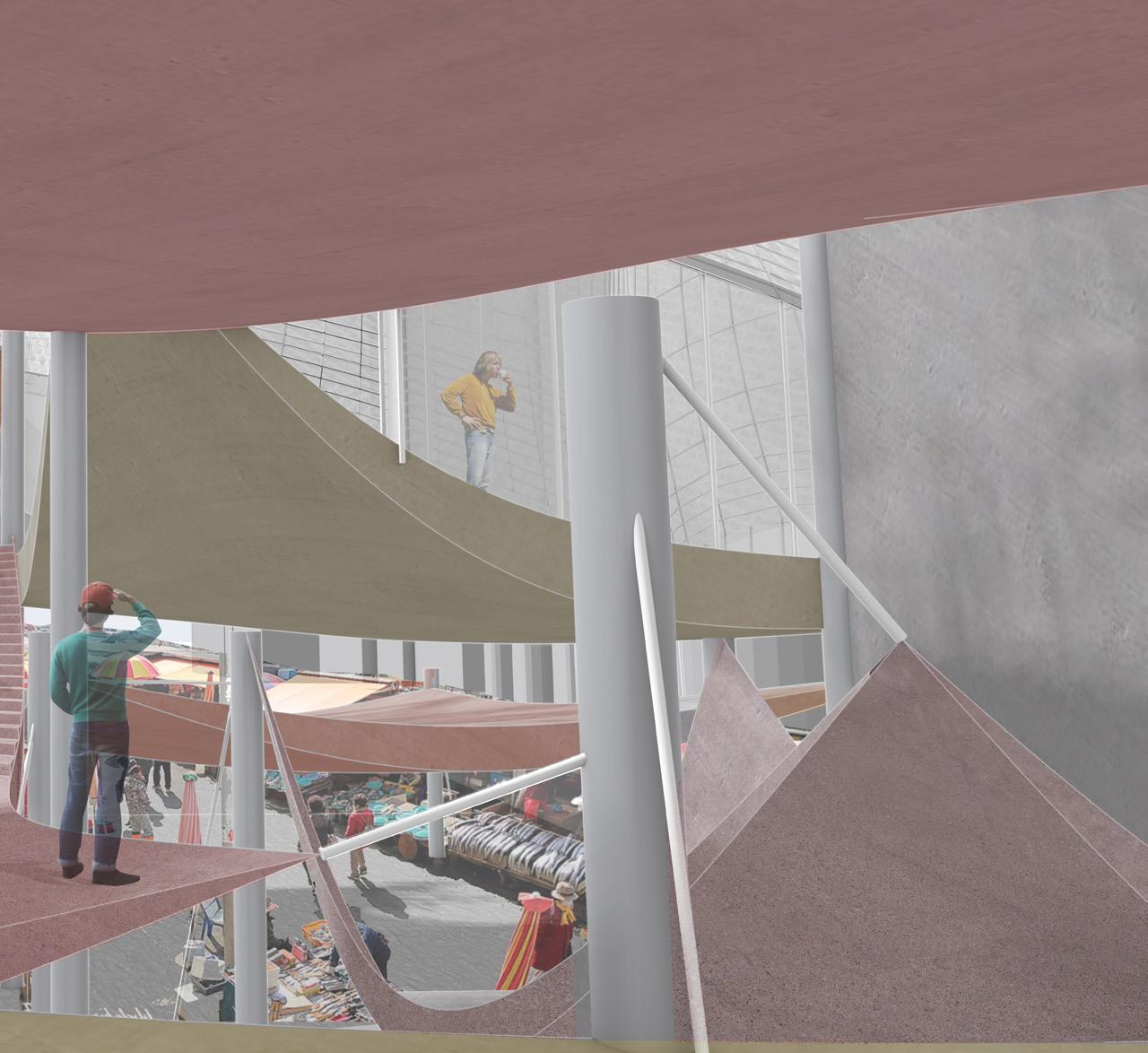 This project preserves the traditional market while adding vibrancy through a cultural facility above it, which also provides the market’s entrance and roof. Inspired by the market’s iconic canopy, the upper structure employs a tensile system that maintains the market’s distinctive ambiance while introducing modern functionality.