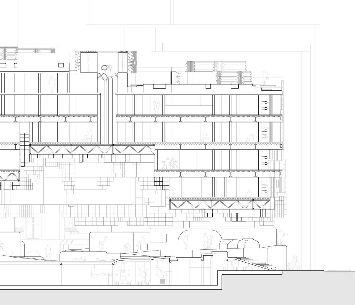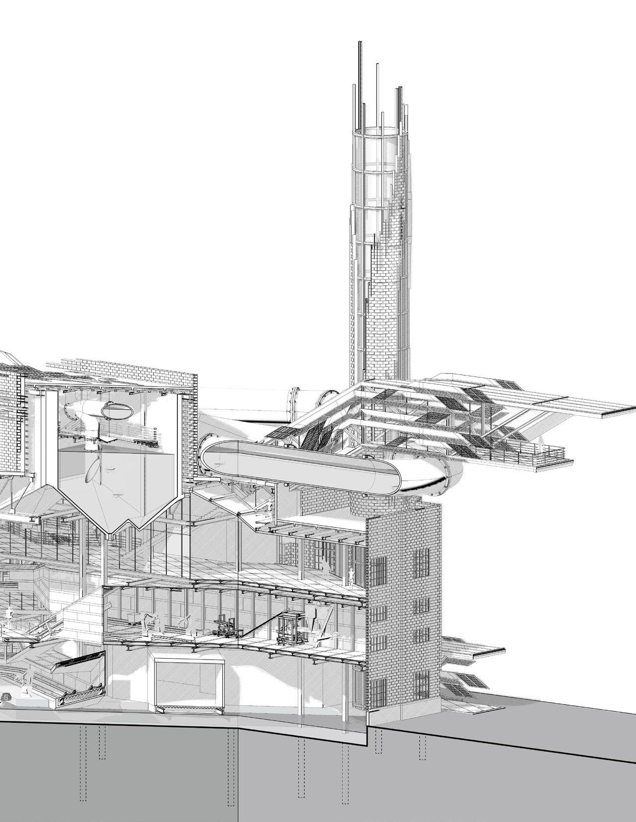 Functioning as a local landmark, the building operates like a living organism—grafted onto existing structures and adapting to its surrounding environment.
