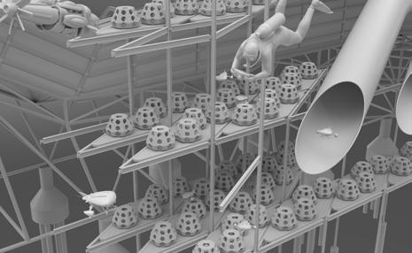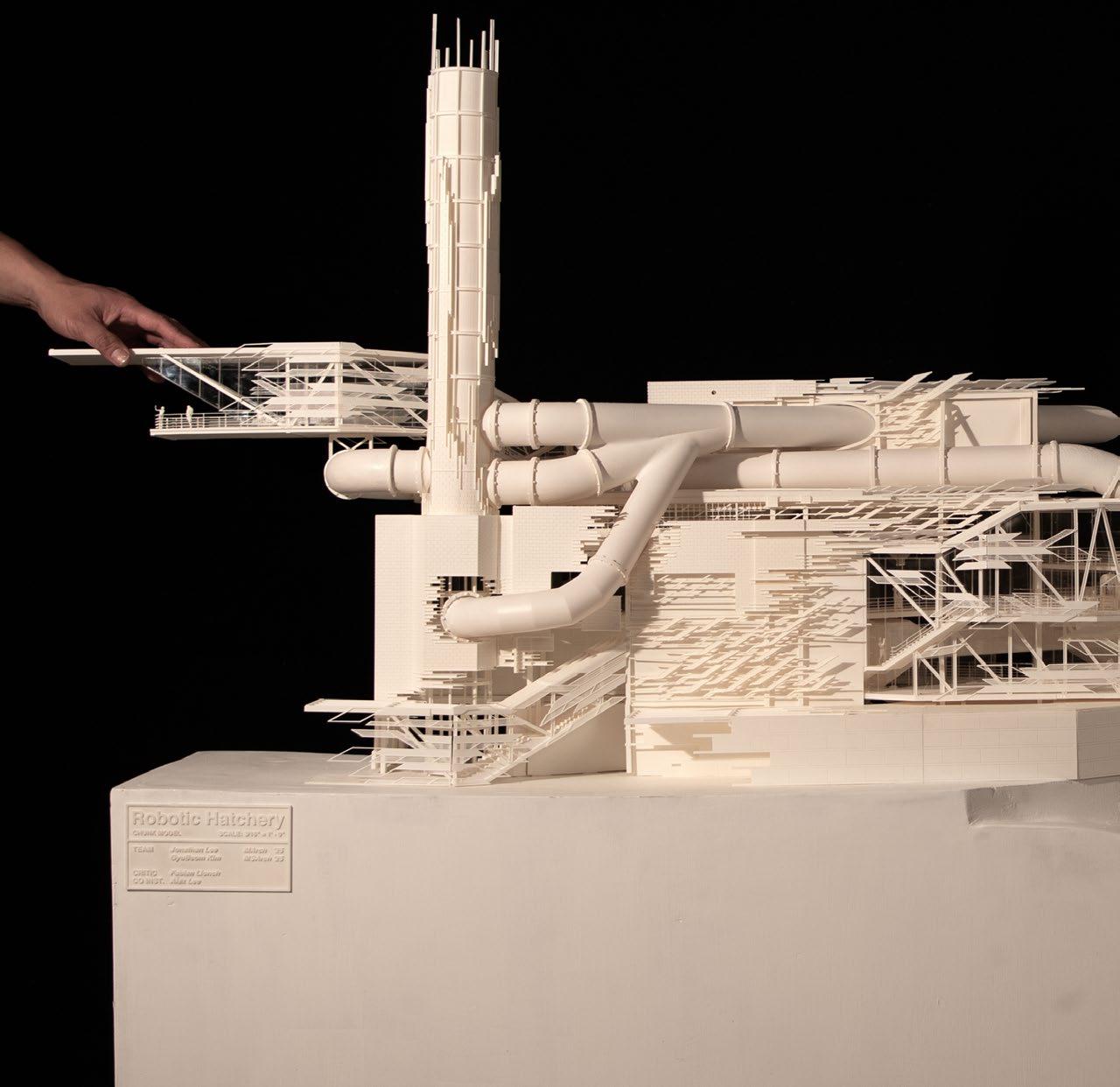 This project encompasses infrastructure for automated oyster farming, reef production and maintenance, as well as public programs for education. Based on biological metaphors, we approached the design with a systems-thinking mindset rooted in scalable and selfsustaining biological processes.