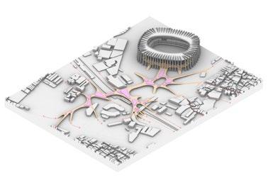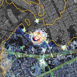 The design connects multiple potential spots across the site, where public programs and an activated pedestrian network form key urban nodes. Simultaneously, rainwater collection and a flood-responsive plaza serve as passive strategies addressing water scarcity and flooding.