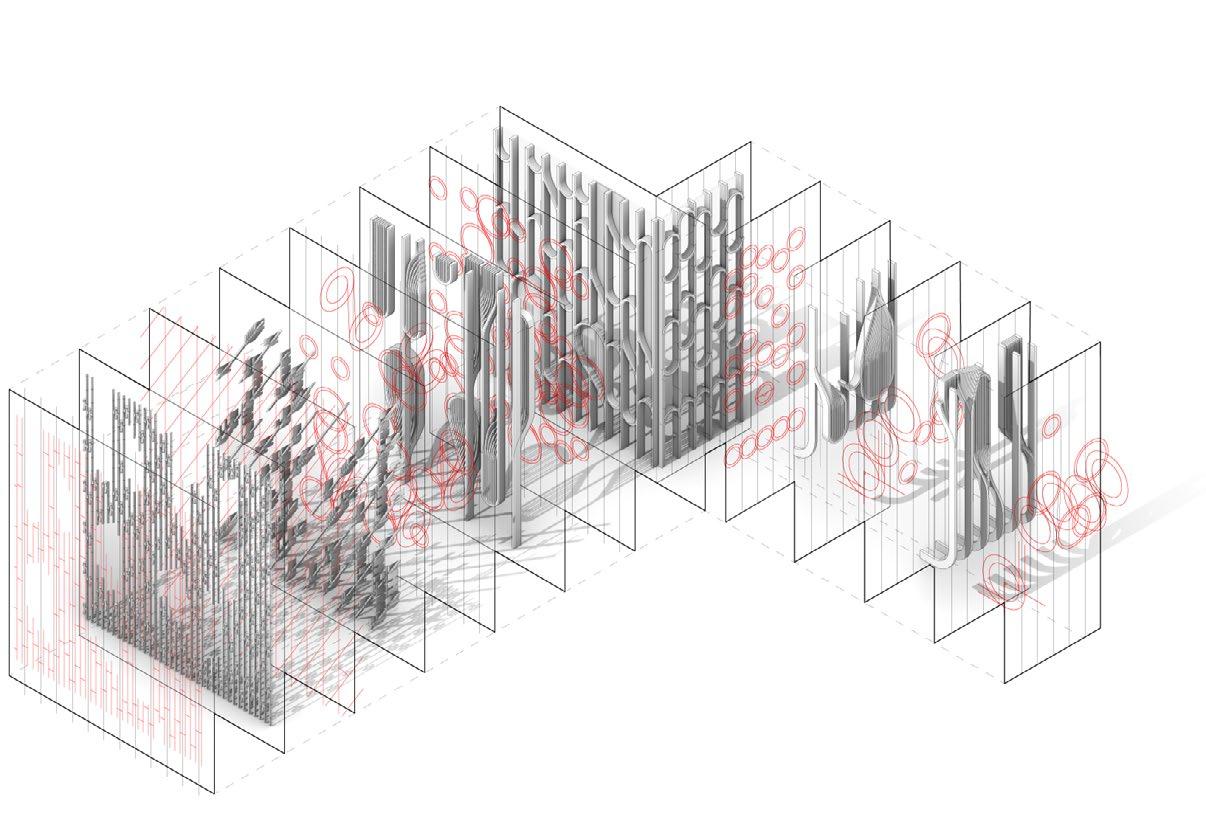 Architecture is approached here as a medium of sensation and symbolism beyond structure or function. Infrastructural poetics reframes systems as more than technical frameworks, instead treating them as carriers of rhythm and atmosphere through material transformation, repetition, and generative geometry. Each work arises at the intersections of art and engineering, memory and ecology, the digital and the hand-drawn, forming a layered architectural language shaped by experimentation, iteration, and coexistence.