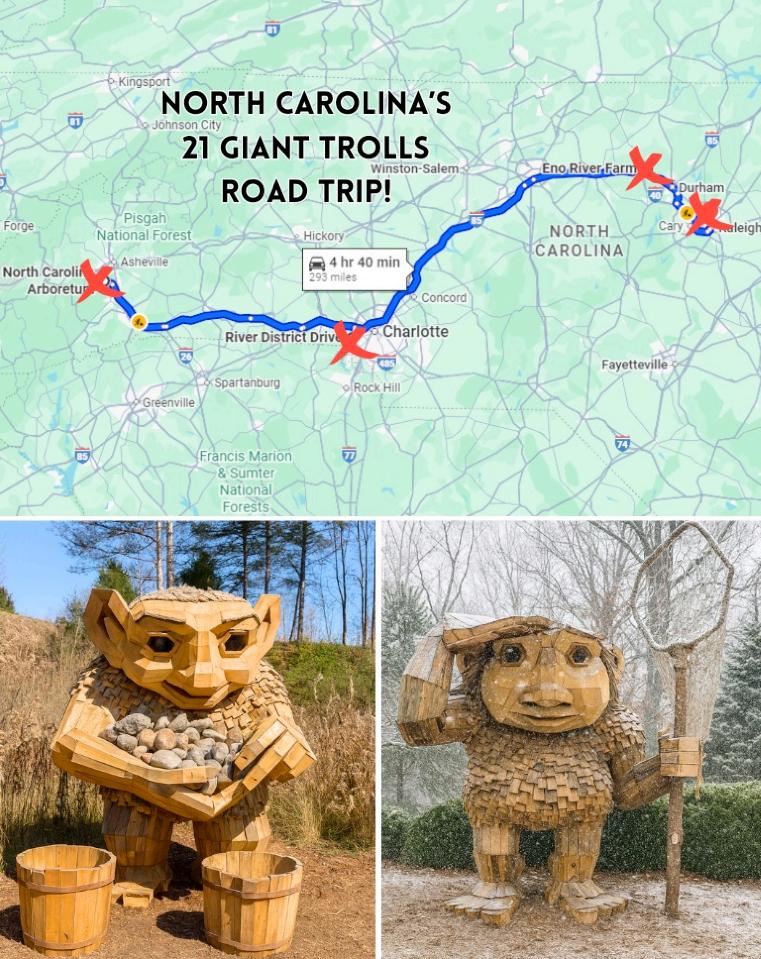 North Carolina’s 21 Giant Trolls Road Trip takes you to see that state's 21 giant trolls at four magical stops! Each stop along this route is filled with massive wooden trolls…many built by Danish artist Thomas Dambo. You start at Dix Park in Raleigh, where five towering trolls hide in the fields and trees. In Charlotte, the River District features one mighty troll watching over the area. At Eno River Farm, three trolls bring a fun surprise to the trails and berry fields. Your trip ends in Asheville at the North Carolina Arboretum, the brand new home to twelve trolls tucked into the gardens, forest paths, and open spaces among the gardens here...made even more magical as six of the twelve can be found among the stunning Christmas lights display at the gardens!