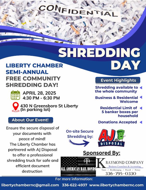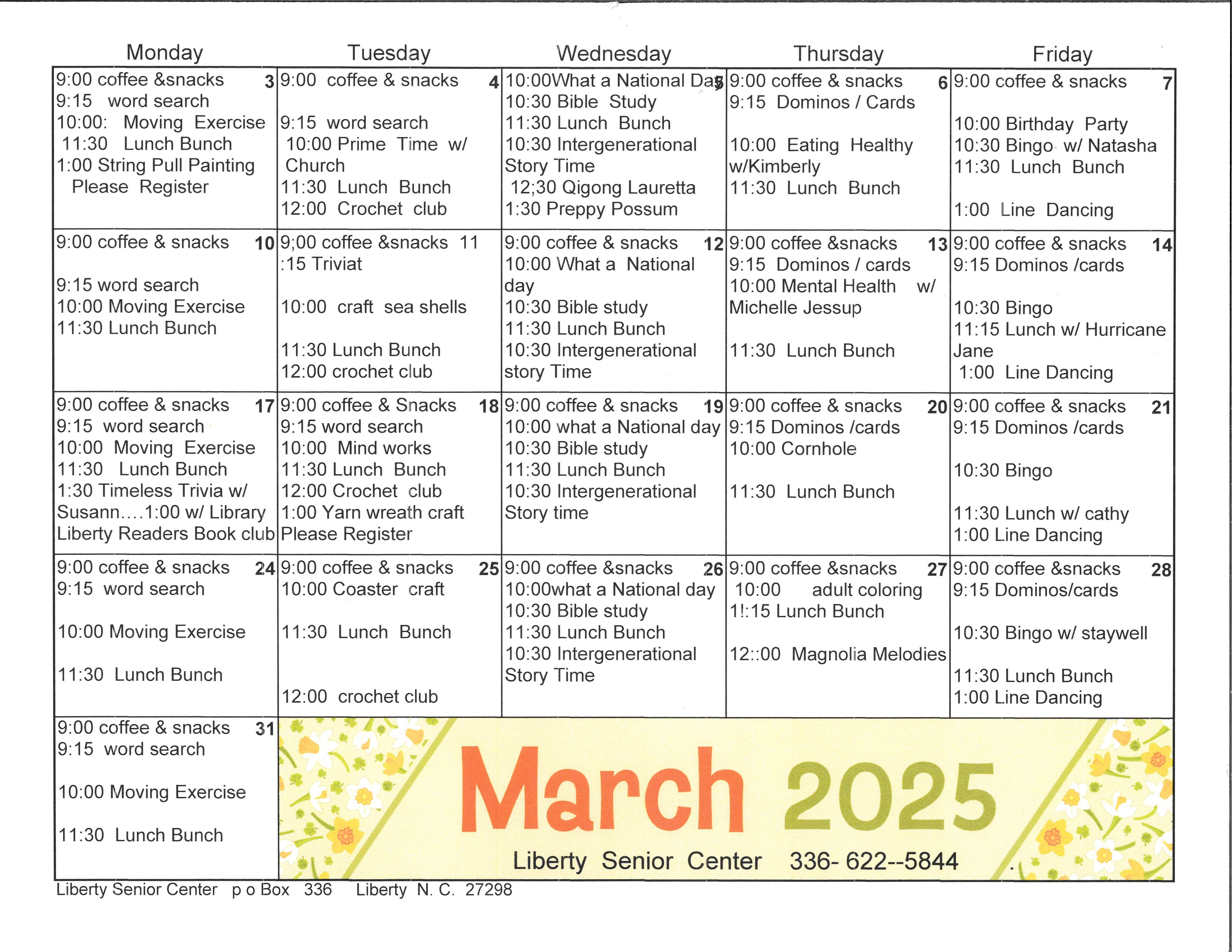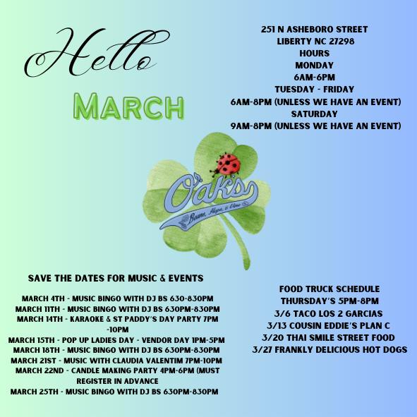 Thursday, March 6th, 6:00 p.m. - Fundraiser Paint Night for the Liberty Public Library. Contact Brenda at 336-483-1231 to register