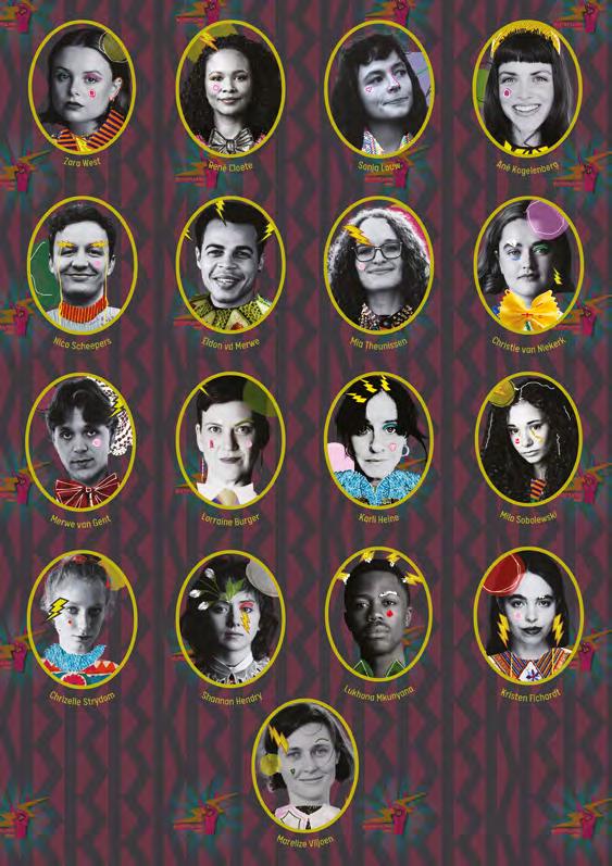 Megan Meyer • Melissa Myburgh • Mercy Kannemeyer • Miandra Hayward • Michaela Weir • Mikayla Joy Brown • Mike van Graan • Mikyall Harris Minke Marais • Misha Krynauw • Molupi Lepeli • Moniq Gouws • Nell van der Merwe • Ngwako C. Maifala • Nico Luwes • Nico Taljaard • Nicola Hanekom • Niël Rademan • Nisa Smit • Ntsikayomzi Benya • Obed de Koker • Obett Motaung • Paula Fourie • Philip Rademeyer • Philip Theron Pierre-André Viviers • Pieter Jacobs • Pieter Odendaal • Pietie Beyers • Preston Hugo • Qondiswa James • Rachelle Greef • Rafek Mammon • Retief Scholtz • Riana Scheepers • Ricardo Arendse • Roland du Preez • Rondo Mpiti-Spies • Shaun Oelf • Sibahle Mabaso • Sibuyiselo Dywili • Siphenathi Siqwayi • Sjaka Septembir • Stephanie Burnett • Stephanie Jenkins • Stephina Zwane • Stephren Saayman • Sylvia Vollenhoven • Tankiso Mamabolo Temple Hauptfeisch • Ter Hollmann • Thozama Busakwe • Thukelo Maka • Tifany Saterdaght • Tiisetso Mashifane • Tinarie van Wyk Loots • Turner • Toroga Denver • Tshegofatso Mabele • Veronique Jephtas • Vuyokazi Ngemntu • Wentzel Lombard • Wessel Pretorius • Wilken Calitz • William Hindley • William Oosthuizen • William Vermaak • Wim Vorster • Xolisa Ngubelanga • Zac Fleishman • Zack Mtombeni • Zoë Chetty • Zubayr Charles