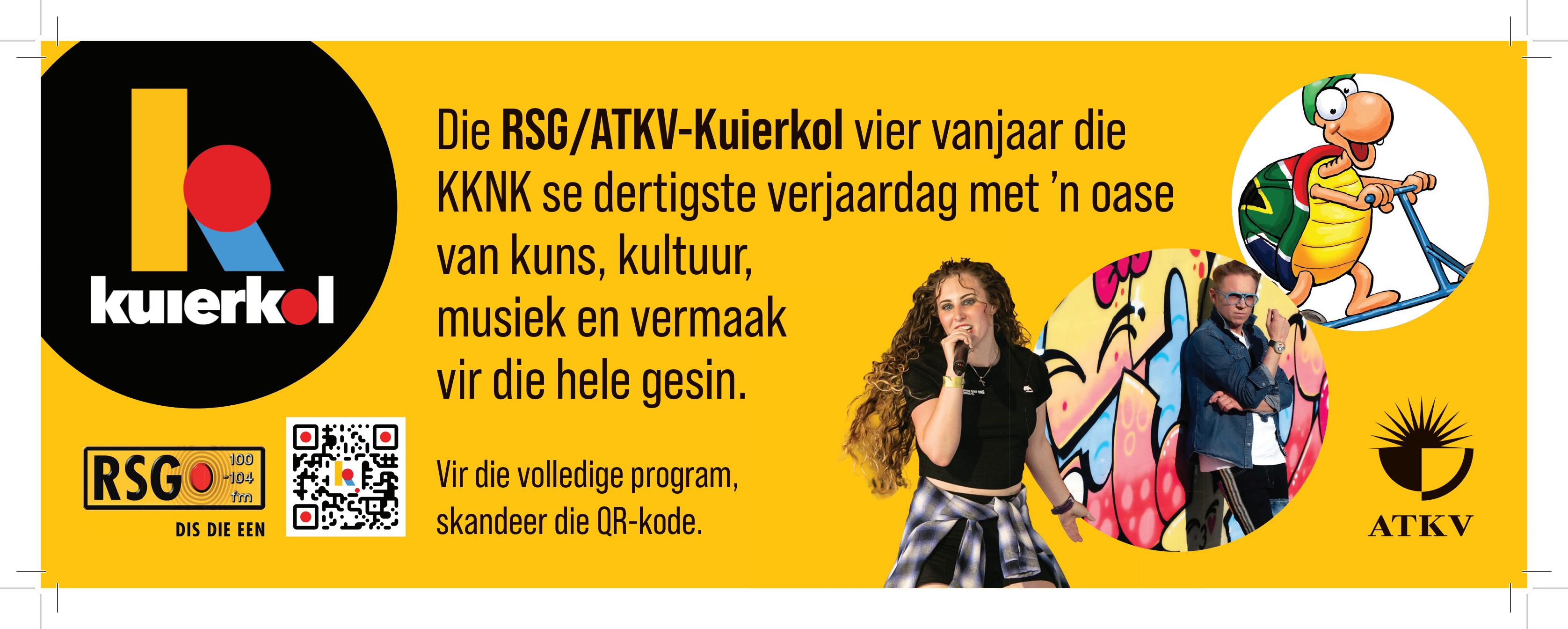 RSG en die ATKV se Kuierkol is terug by die KKNK en beslis dié plek om te wees vir die KKNK se 30ste verjaarsdag! Kom geniet ’n propvol program met regstreekse uitsendings, vermaak, speletjies vir oud en jonk, kinderpret en musiekoptredes. Ontmoet en gesels met RSG se gewilde omroepers en geniet die heerlike versnaperings wat rondom die Kuierkol beskikbaar is. Maak ’n draai, ons sien jou daar!