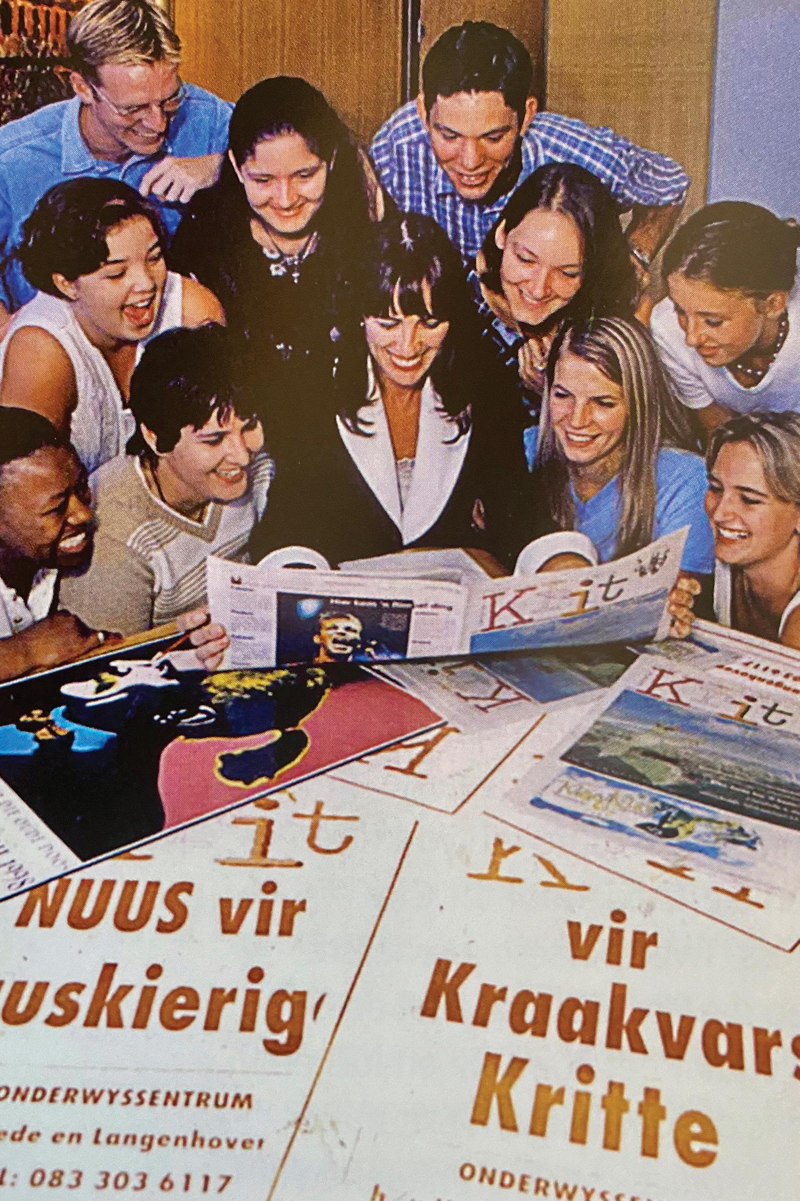 Anet Pienaar-Vosloo en die jong redaksielede van Krit, die KKNK se feeskoerant wat die eerste keer in 1996 verskyn het.