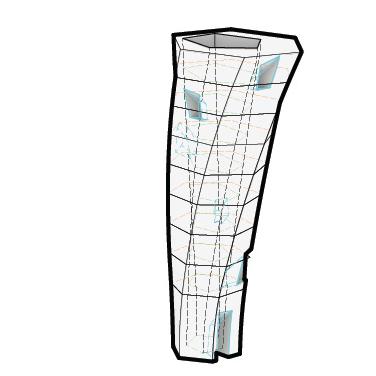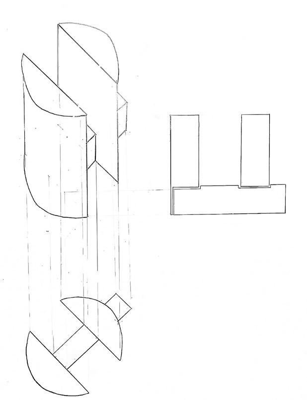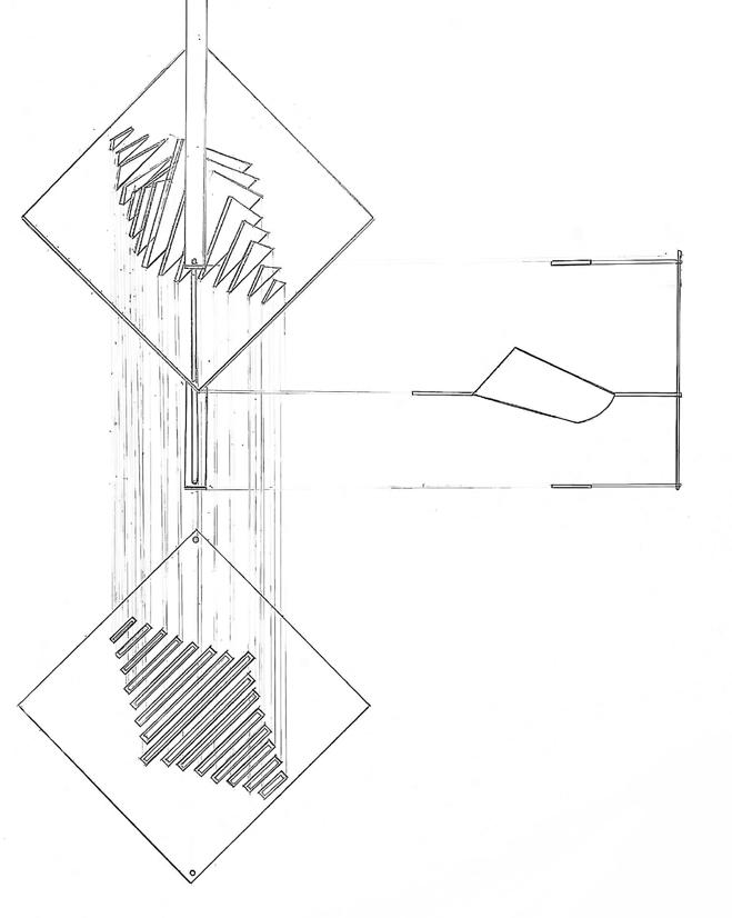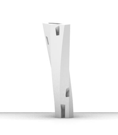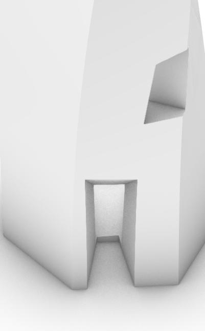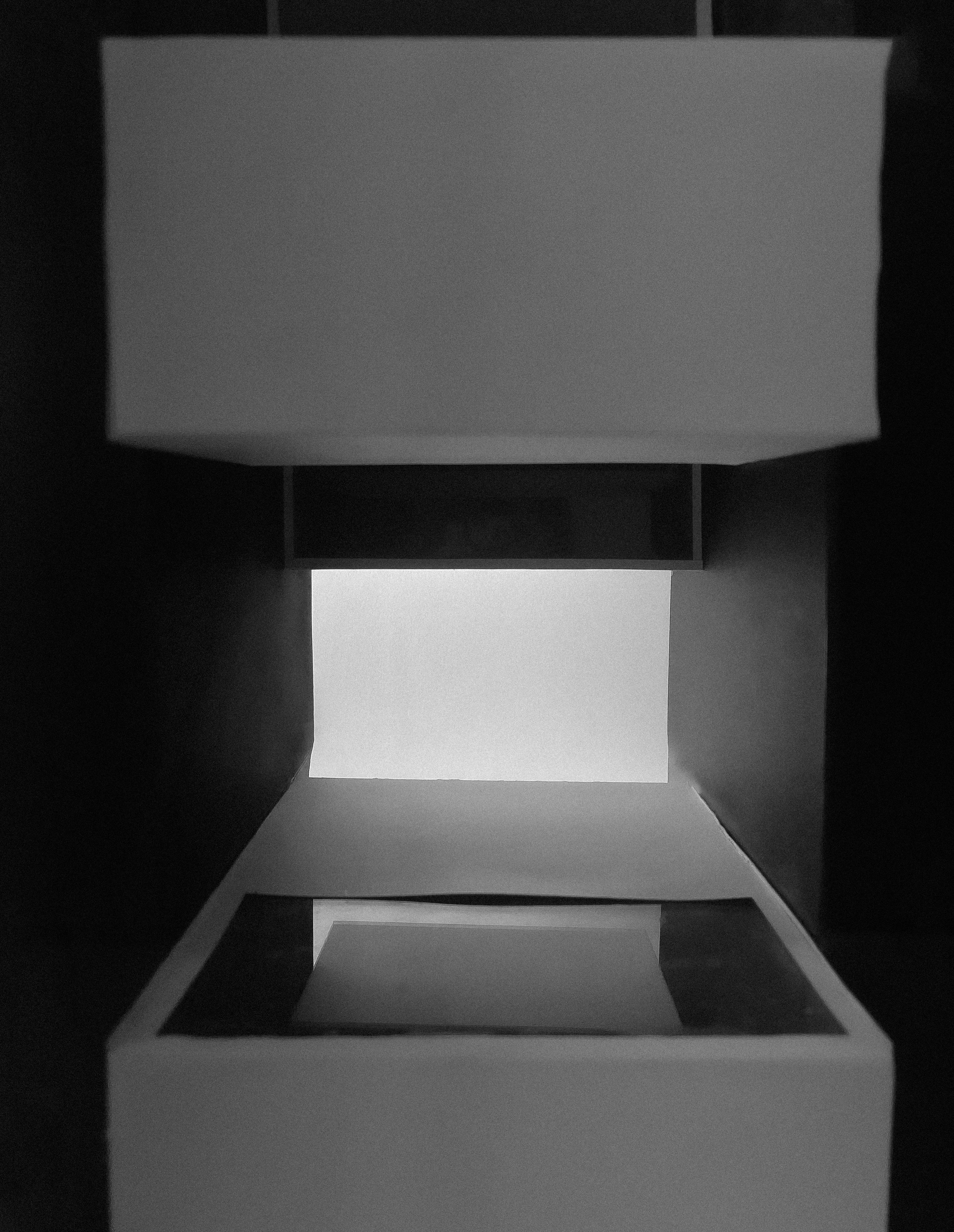 This tower plays with the qualities of light. Through its openings it manipulates the pathway of light rays through the tower. Thus, the windows direct one’s sight to the upward center of the tower. The tower is based on the contrast between light and darkness, and the feelings experienced when entering from a wide to a narrow space in relationship to light, and vice versa. Another detail of this tower is the positioning of the widows in the angles of the inner space holder of it, which is a pentagon. This makes it possible for the internal space to appear enlarged and creates flat surfaces for the light to bounce through the tower.
