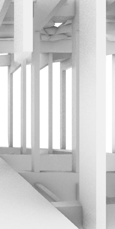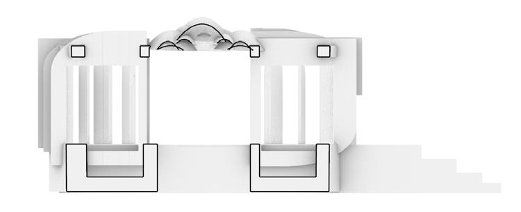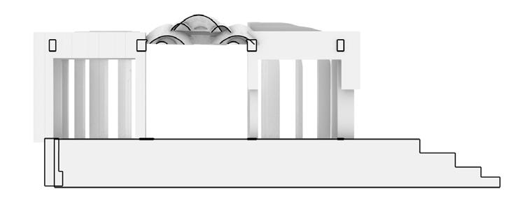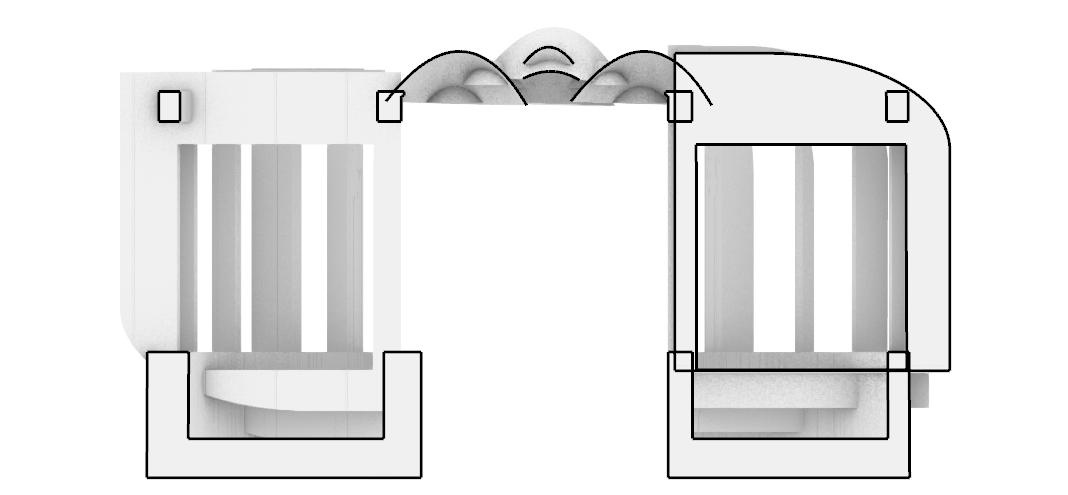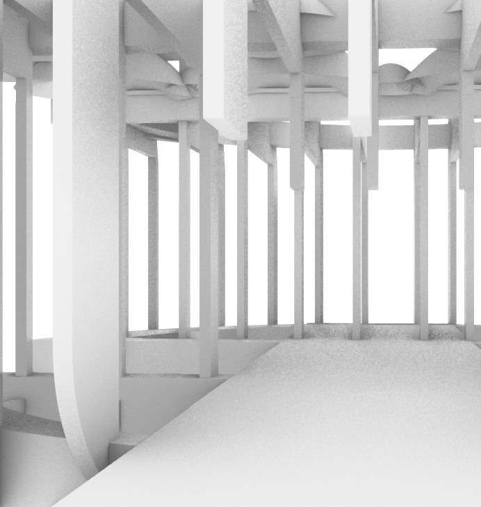 The exterior limits the visuality of the inside facilities, and welcomes individuals into the building, framing a longitudinal view of the entrance to the garden. Some c-platforms are shifted outside of the rectangular frame to create shelter to people entering the building. The upward area of two of these platforms is used to create public spaces within the building, and thus contributing to the diversity of it.