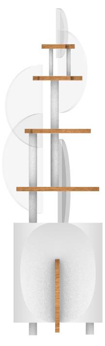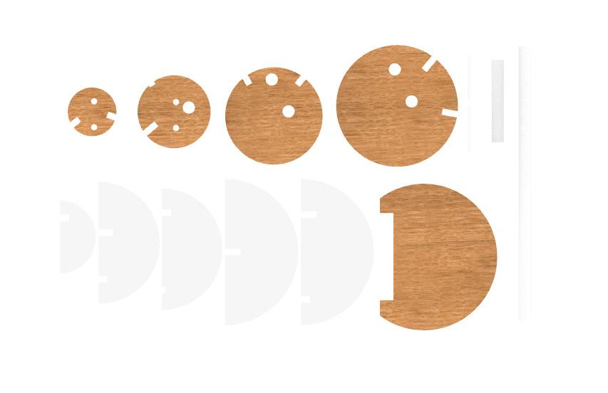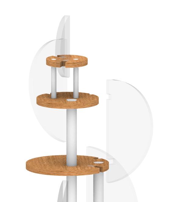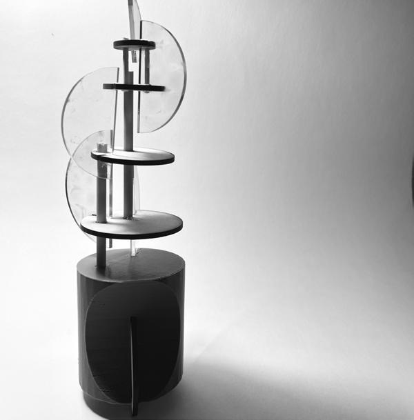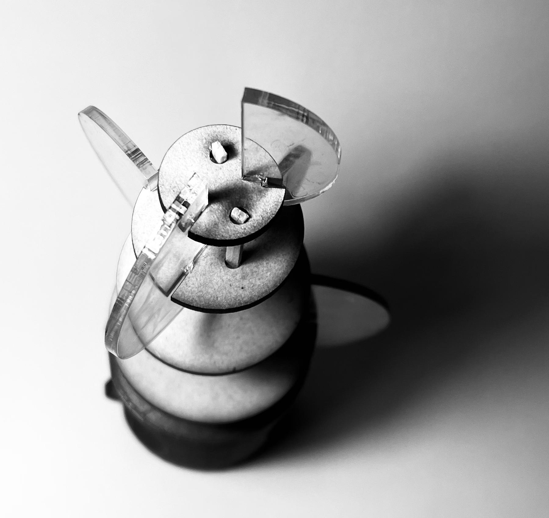 This trophe was constructed using the repetition of circular shapes, and by manipulating their symetry.There is a circular pathway the flaps experience as the top is approached, not only changing their rotation but also decreasing the scale of each flap. Thus, creating a hierachy and distinction in the shape of this model. Each transparent flap is connected to the wodden circular platform by joints. And the whole structure is held by a