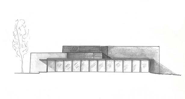 The exterior limits the visuality of the inside facilities, and welcomes individuals into the building, framing a longitudinal view of the entrance to the garden.