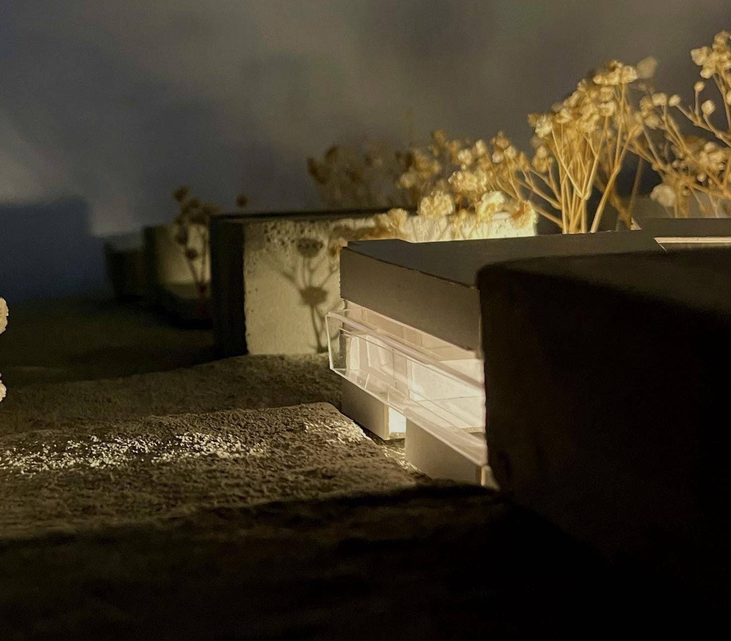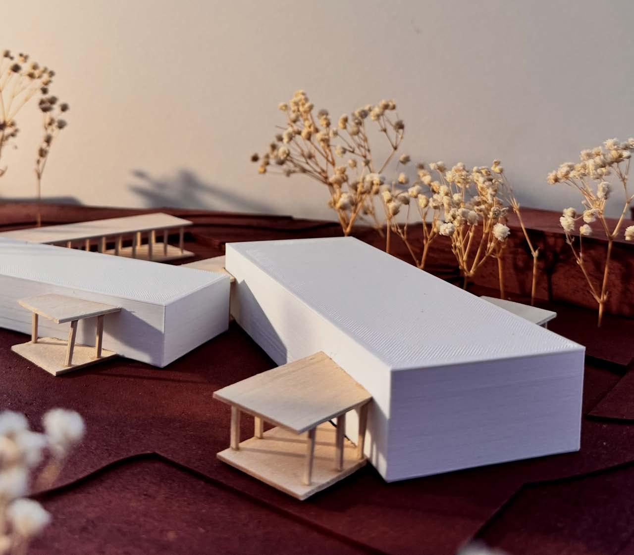 The services are placed into two extruded volumes, in order to become invisible to the eye, and placing the main facilities into c-platforms, creating internal relationships between individuals.