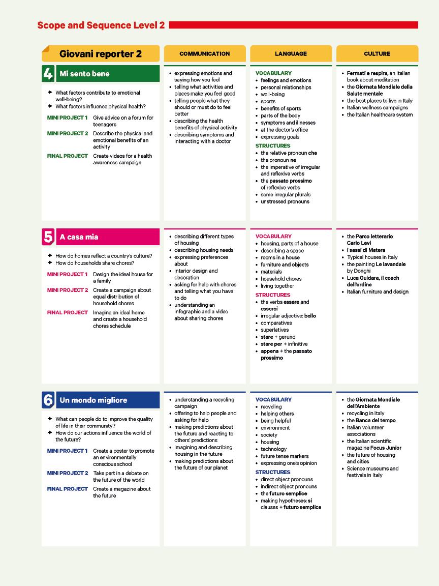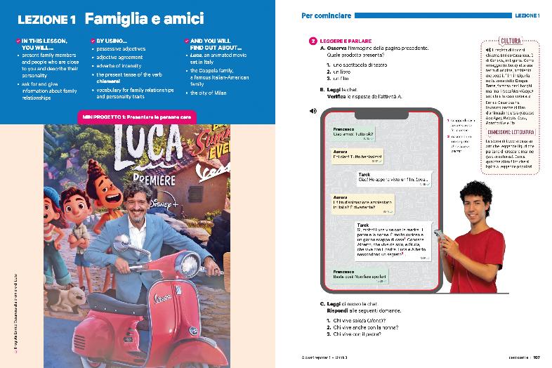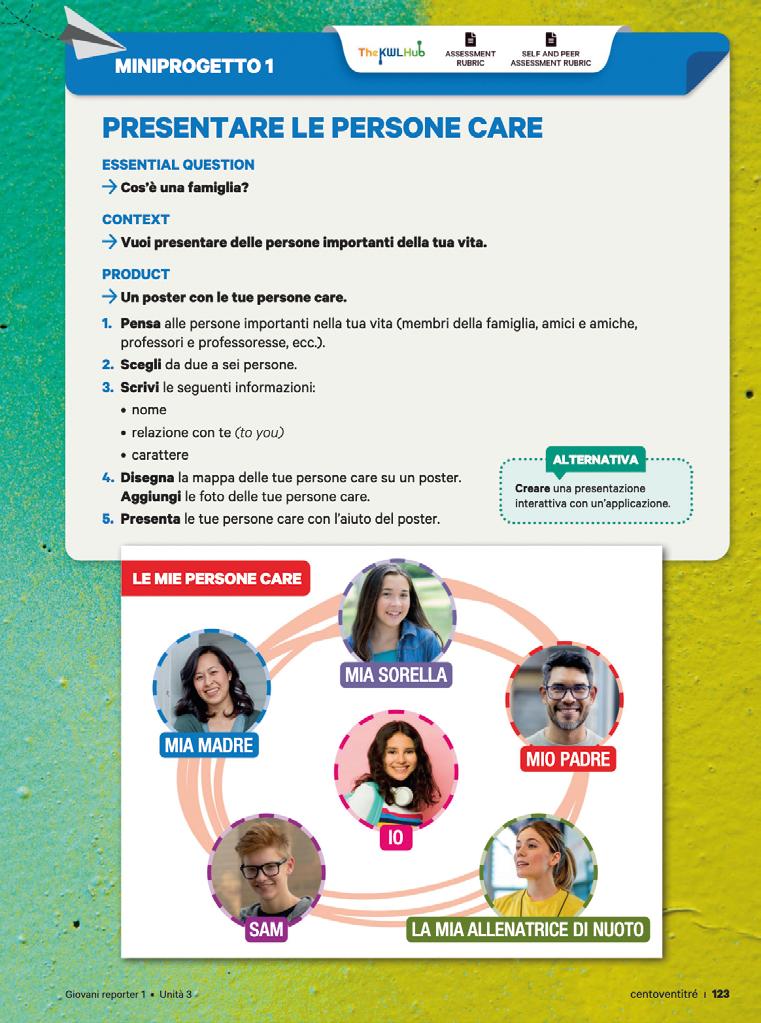 The two Miniprogettos (one per lesson) and the Progetto finale (one per unit) are real-world projects in which you will use the grammar, vocabulary, and communicative skills you learned in each lesson.