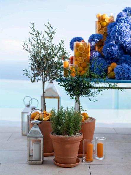 The lounge layout brings a relaxed, Riviera‑leaning warmth to the lawn with deep blue seating, cane and wicker textures, and sculptural wood pieces. Terracotta accents, citrus displays, and patterned pillows add easy color, while lanterns and soft lighting shape comfortable pockets for guests to gather The result is an inviting, sun‑soaked living‑room‑style setting that feels both coastal and casually refined
