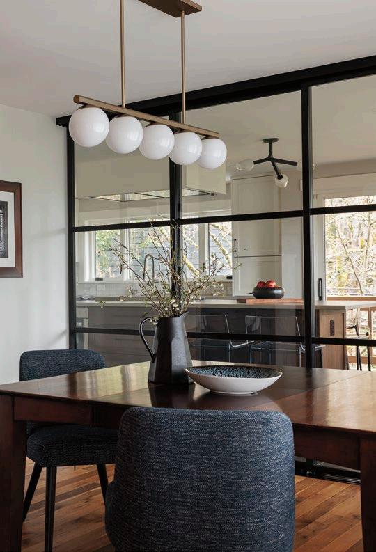 “The remodeled kitchen was expanded into the former kitchen table space, and the wall between the kitchen and dining room was removed and replaced with large sliding glass doors that stack to one side. The idea for the glass doors came about to keep some audio separation in the spaces, when need be, as both homeowners work from home and one of the children does schooling from home.