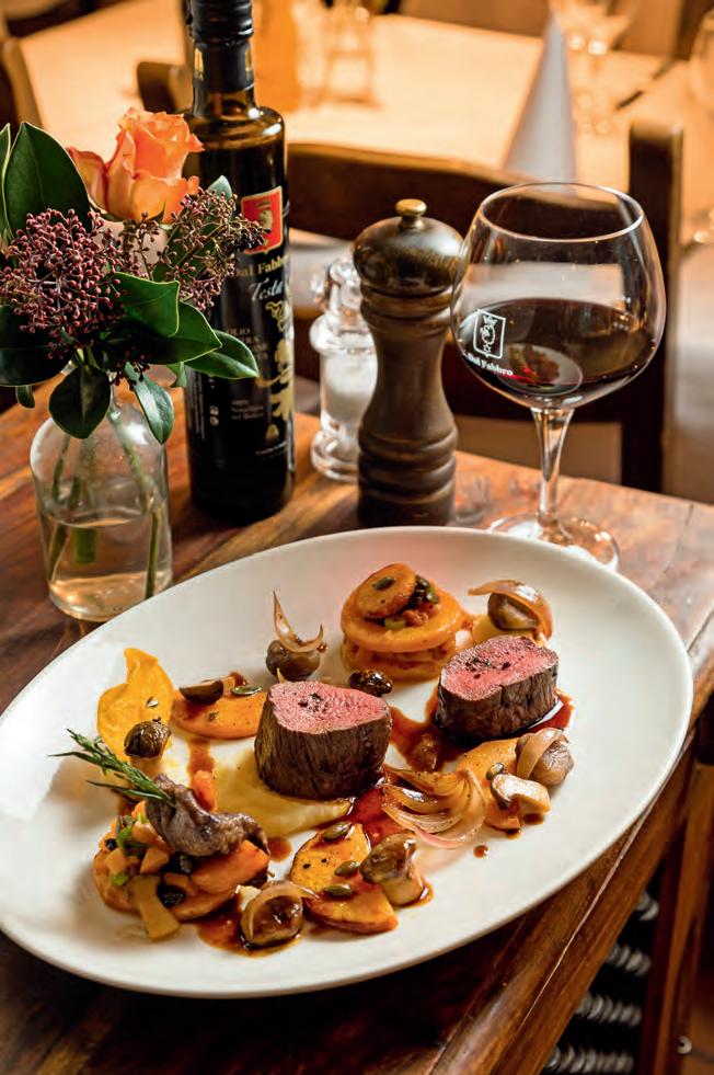 Ein echter Tipp, nicht nur für die Hotelgäste, sind die beiden Restaurants des Hauses. In einem stilvoll eleganten Ambiente speisen Gäste zu jedem Anlass im „PanoramaRestaurant“. Dort laden internationale Spezialitäten zu einer kulinarischen Entdeckungsreise ein, ergänzt durch saisonale Gerichte und Aktionswochen. Als „Haus der BadenWürttemberger Weine“ ist es Gastgeber Ronny Mechnich und seinem Team ein besonderes Anliegen, ihren Gästen die Vielfältigkeit der regionalen Winzer vorzustellen. Wer gerne typisch schwäbisch in einem rustikalen Ambiente speist, wird die „Kutscherstube“ lieben. „Hier servieren wir bevorzugt regionale Spezialitäten aus heimischen Produkten: von der zünftigen Vesper bis zum klassischen Zwiebelrostbraten mit hausgemachten Spätzle und frischen Marktsalaten. Dazu empfehlen unsere Servicekräfte ein passendes ,Vierteleʻ Württemberger Wein oder ein frisch gezapftes Bier“, sagt Direktor Mechnich. Und nach dem Essen lockt zum gemütlichen Tagesausklang die stimmungsvolle BistroBarLounge „Bajazzo“, die auch bei den Einheimischen gut ankommt. ■