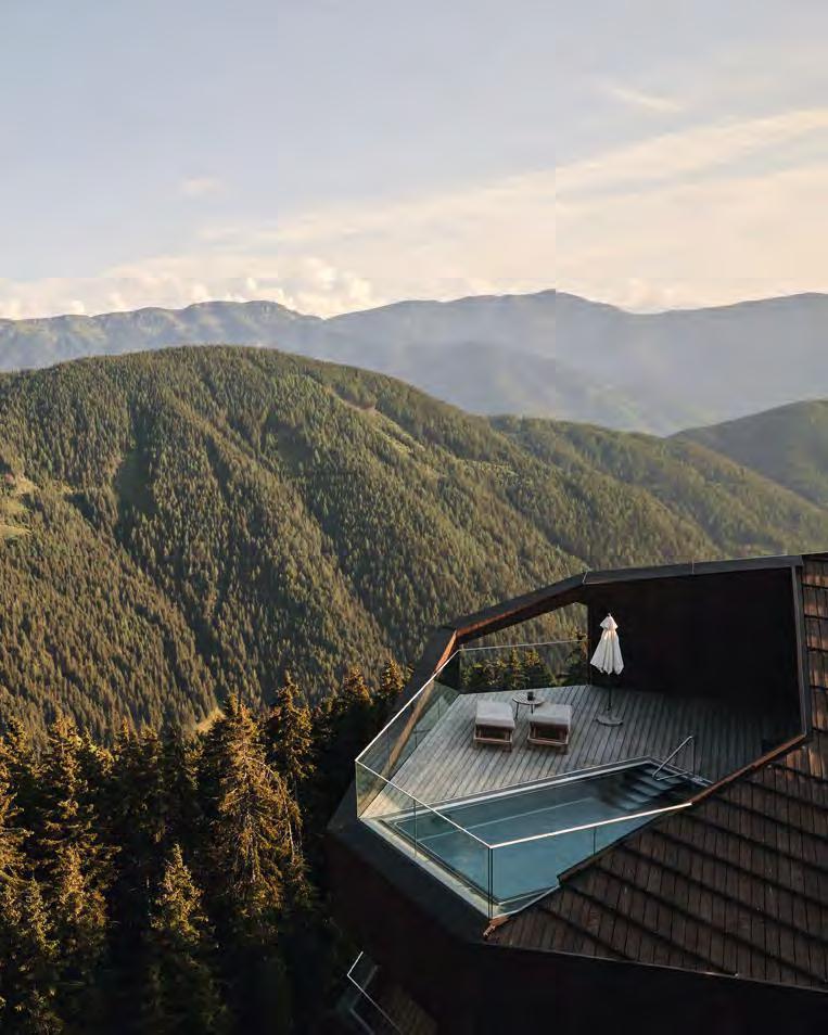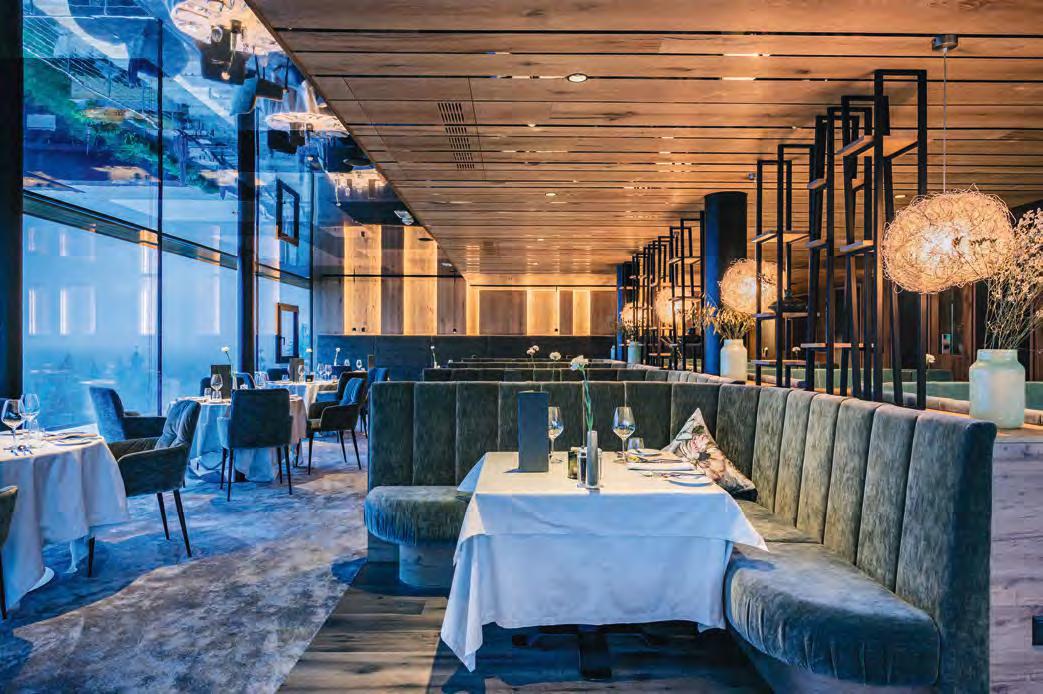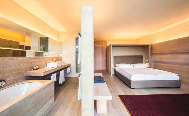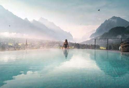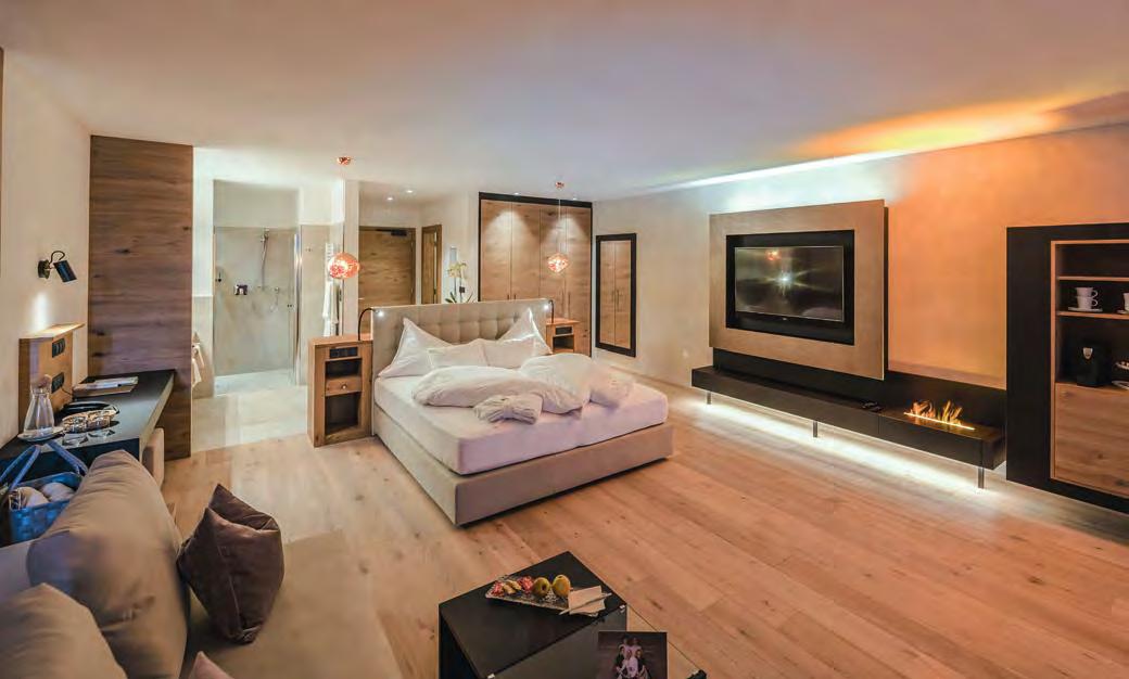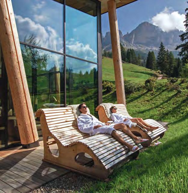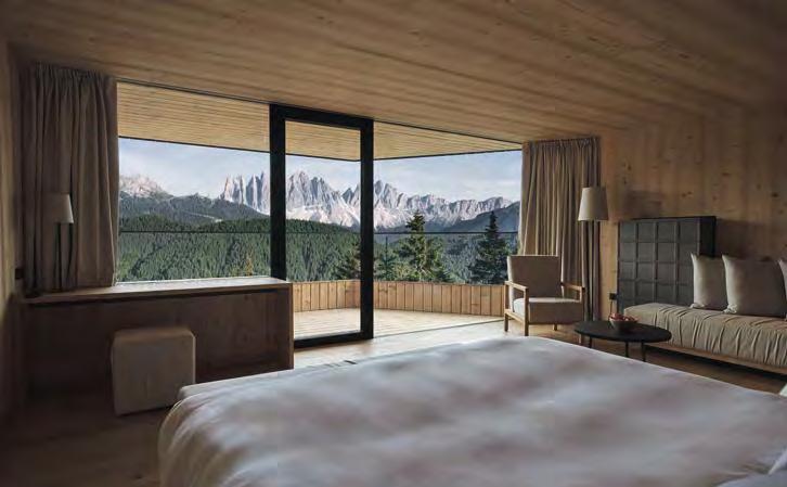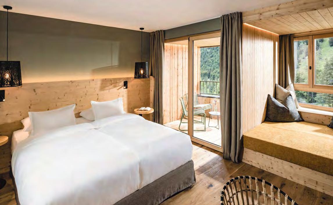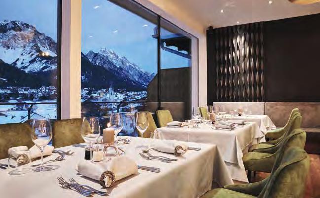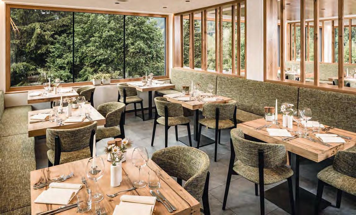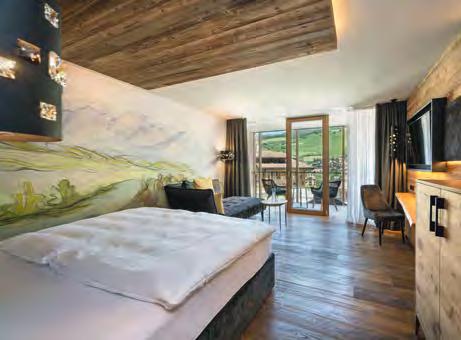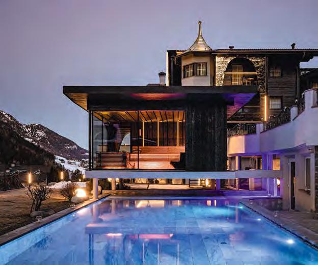 zehn neu gestylte Zimmer mit einem eleganten Mix aus hellem Holz und schwarzen Designer-Möbeln, frei stehender Badewanne und großer Glasfront mit atemberaubendem Blick auf St. Ulrich freuen. Schnell hat jeder sein Traumzimmer gefunden und stimmt sich auf einen weiteren Glücksmoment ein: Der 1000 Quadratmeter große ART-Spa mit Dampfbad und Biosauna erstrahlt im neuen künstlerischen Design. Darin eine goldene Außensauna mit großer Fensterfassade, welche über dem Schwimmbad schwebt und die Blicke auf die umliegende Bergwelt freigibt. Im 24 Stunden geöffneten Lifestyle-Innenschwimmbad und im panoramischen Außenschwimmbad mit Blick auf die Dolomiten, in den Whirlpools, in der Außensauna, im Private Spa und vielem mehr ist man der Kunst der Entspannung ganz nah. Exquisiter Genuss aus Küche und Keller, dazu das Beste aus der Region, verfeinert mit der Raffinesse anderer Küchenkünste, führt Feinschmecker im Hotel zum Gipfel der Gaumenlust. ■