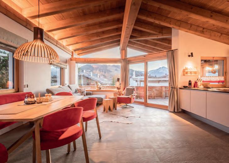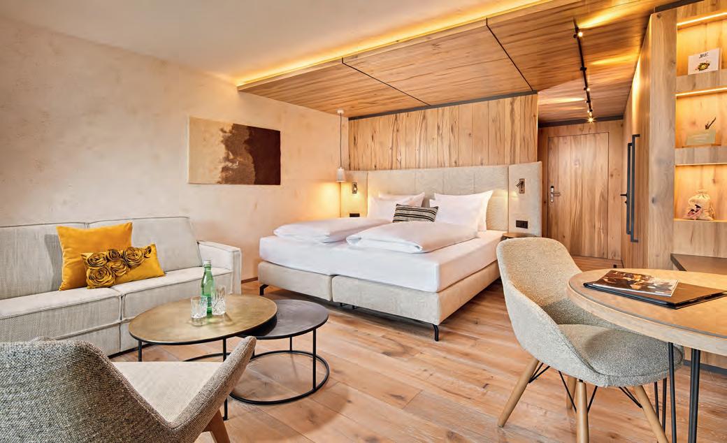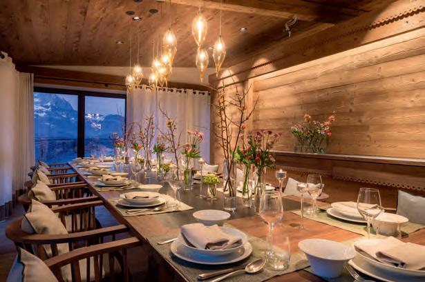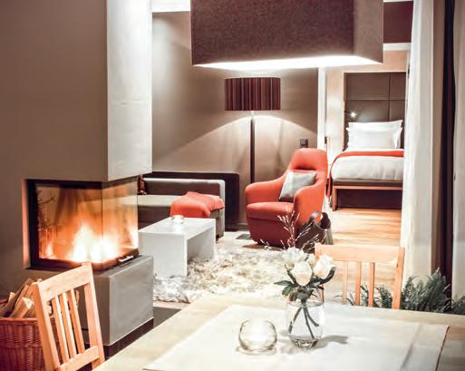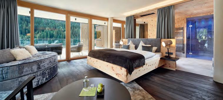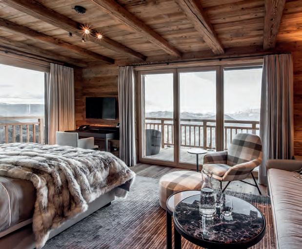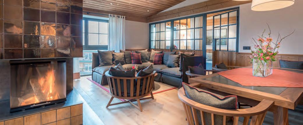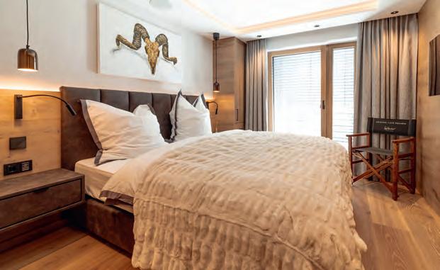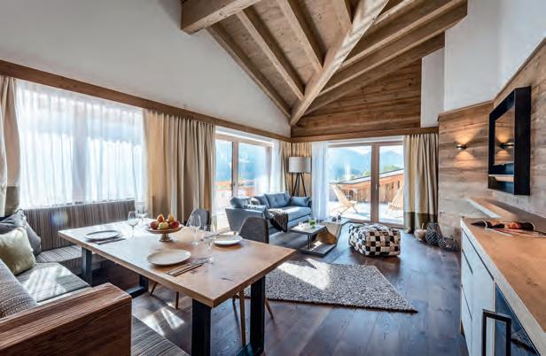punkten im Zusammenspiel mit warmen Farbtönen. Sofas, Sessel und Sideboards des italienischen Labels Minotti, modernes Lichtdesign von Occhio, QueensizeBetten mit Boxspring-Matratzen und weitere Annehmlichkeiten begleiten den Aufenthalt. Den Gipfel der wohnlichen Hochgefühle erlebt man in der großzügigen Mastersuite – ausgestattet mit frei stehender Badewanne, offenem Kamin, Dampfbad und Sauna. Kinder lieben die charmante Suite Mausefalle mit vier urigen, kuscheligen Stockbetten. Alle Suiten verfügen über eine Terrasse. Große Fensterfronten geben den Blick auf die mächtige Bergkulisse frei.