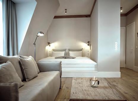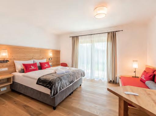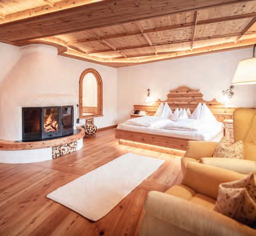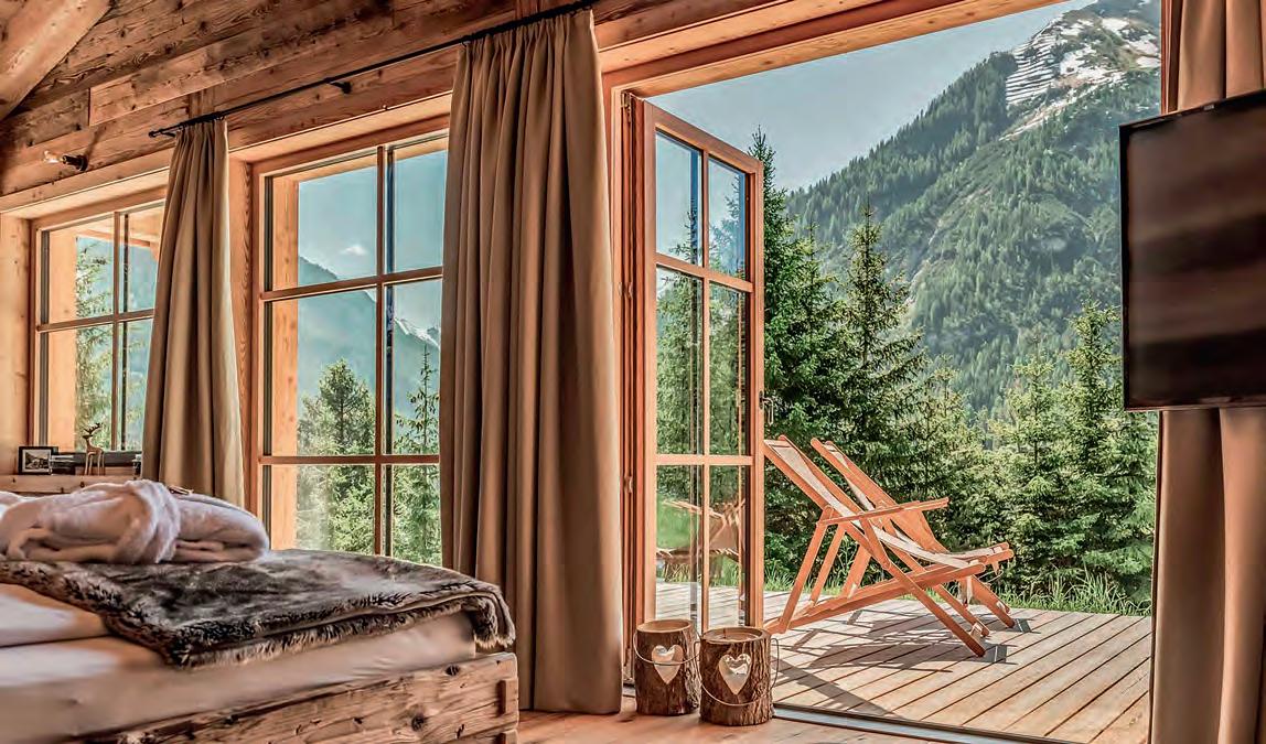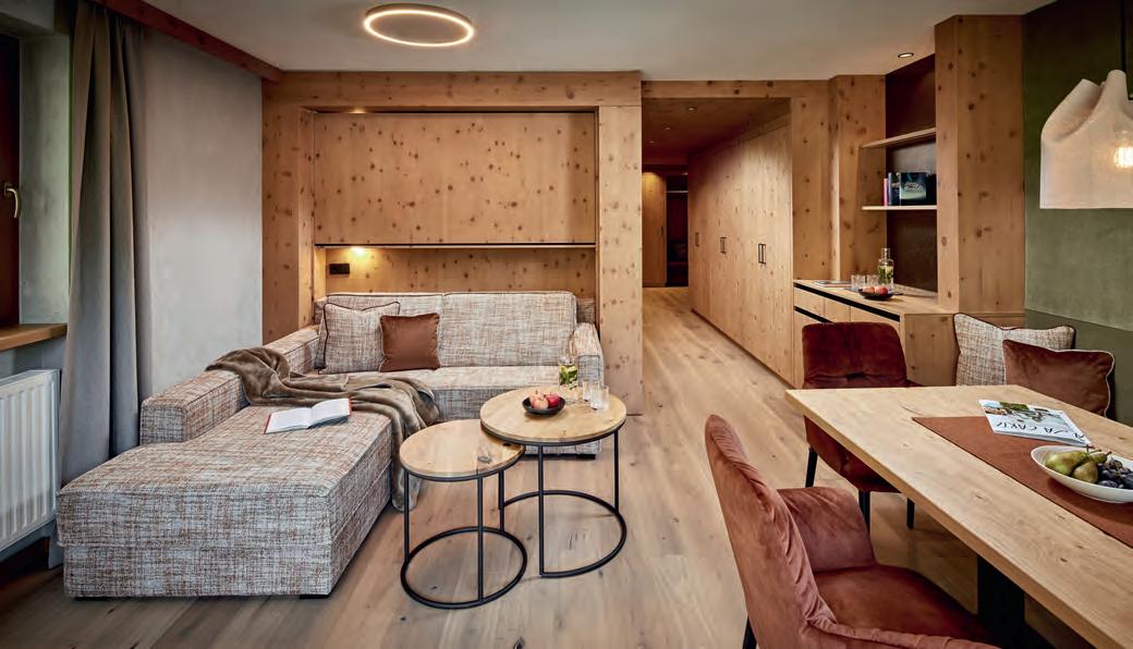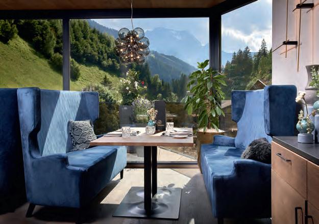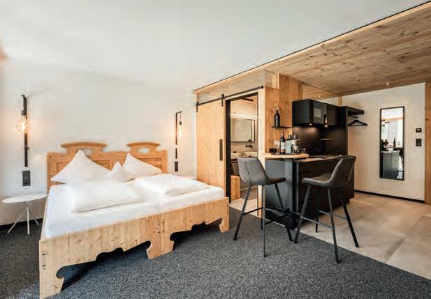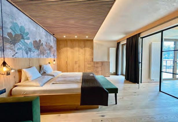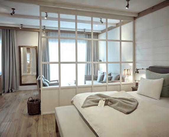 punkten im Zusammenspiel mit warmen Farbtönen. Sofas, Sessel und Sideboards des italienischen Labels Minotti, modernes Lichtdesign von Occhio, QueensizeBetten mit Boxspring-Matratzen und weitere Annehmlichkeiten begleiten den Aufenthalt. Den Gipfel der wohnlichen Hochgefühle erlebt man in der großzügigen Mastersuite – ausgestattet mit frei stehender Badewanne, offenem Kamin, Dampfbad und Sauna. Kinder lieben die charmante Suite Mausefalle mit vier urigen, kuscheligen Stockbetten. Alle Suiten verfügen über eine Terrasse. Große Fensterfronten geben den Blick auf die mächtige Bergkulisse frei.