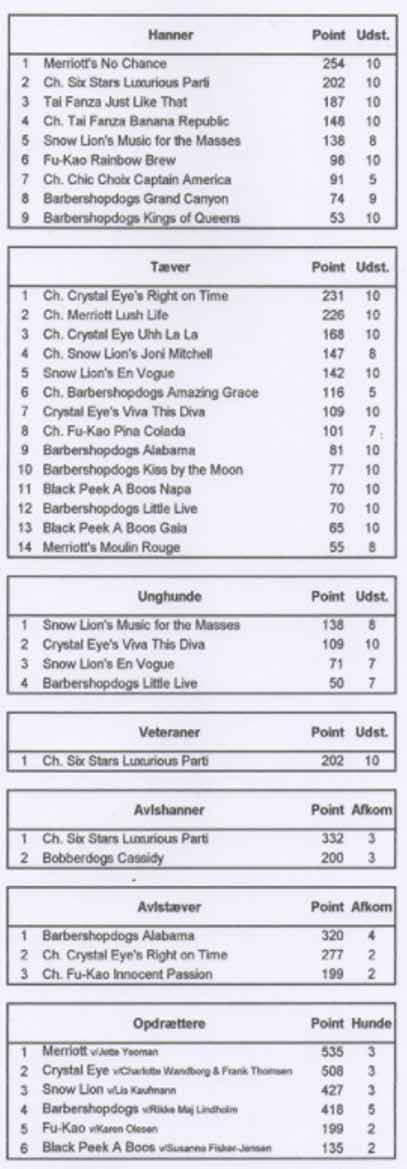 2022 45 April Årets Guldhan og Årets Lhasa Apso 2021 Merriott´s No Chance Årets Guld Baby/Hvalp 2021- Barbershopdogs Miss Anna Årets Sølv Baby/Hvalp 2021 Black Peek a Boos Aura Årets opdrætter 2021 Jette Yeoman Ny DKCH 2021 Barbershopdogs Amazing Grace Ny DKCH 2021 Tai Fanza Just Like That Ny DKCH 2021 Merriott´s Jelly Bean