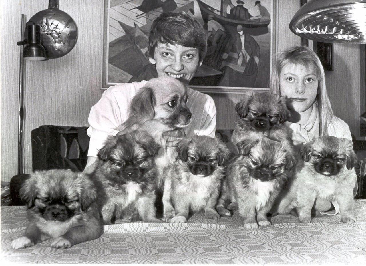 Det sort/hvide foto er fra Jyllandsposten artikkel om det første kuld TS-hvalpe født i Jylland, - her er S. Assam Tes-La midt i flokken (med en hvid pote), moderen er Tenzing Me-Ri, faderen Braeduke Gon-Po. Og så er der et billede af Bente Rytter og hendes mand Kurt.