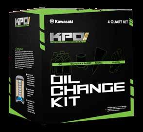 Kit Includes KPO HP Semi-Synthetic 10W-40 ATV/UTV Oil (4 Quarts) • Genuine Kawasaki Oil Filter • Drain Bolt Sealing Washer • One Pair Lime Green Disposable Gloves • One Disposable Funnel