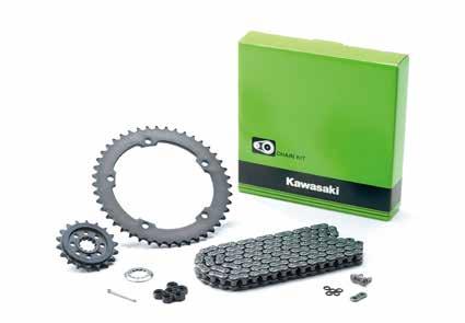 Chain Kit parts packaged with drive chain, engine sprocket, rear sprocket and the other replacement parts (Engine Sprocket Washer, Rear Sprocket Nuts and Cotter Pin etc.) • This complete package from Kawasaki contains all the qualified genuine parts required for correct drive chain replacement for each model • Please note that Kawasaki cannot assume any responsibility for damage resulting from incorrect installation • Dealer installation recommended